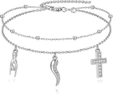 Italian Horn Hand Anklet 925 Sterling Silver Cornicello and Mano Cornuto Layered…