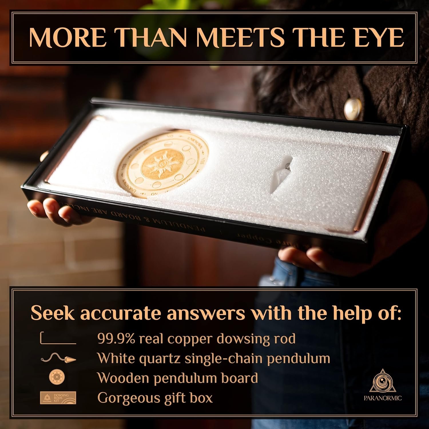 Discover the subtleties of spiritual energy and heighten your intuitive prowess with our premium Copper Dowsing Rods & Pendulum Board Kit. This comprehensive set is a fusion of tradition and precision, designed for seekers of mystical insight and clarity.