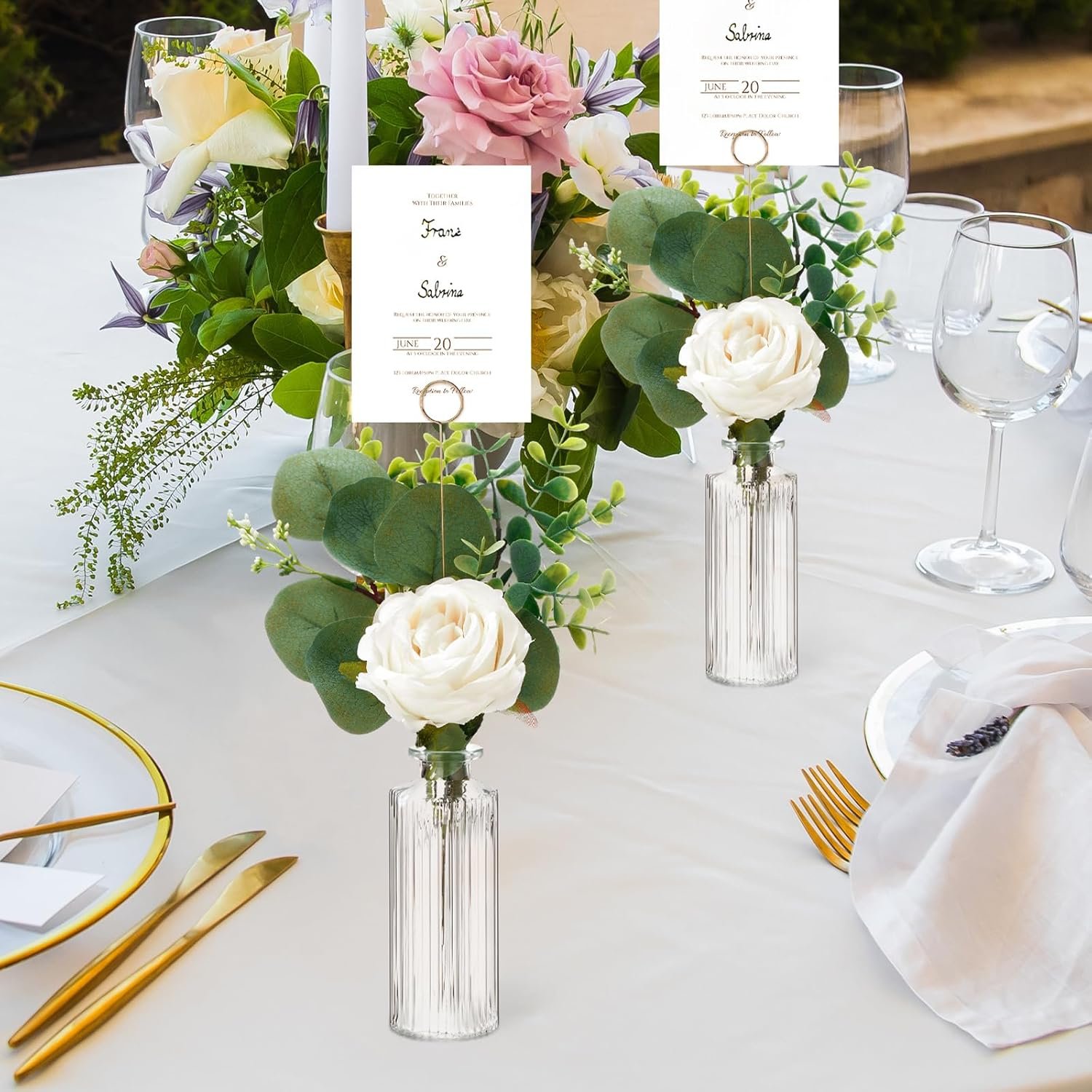 Flowers Table Centerpieces Set Includes: this table number holder set contains 12 gold table number stands, each measuring 11.8 inches in length, 48 loose faux plants, and 12 glass vases measuring 5 x 2 inches; The faux plant varieties include white roses, eucalyptus leaves, and gum leaves