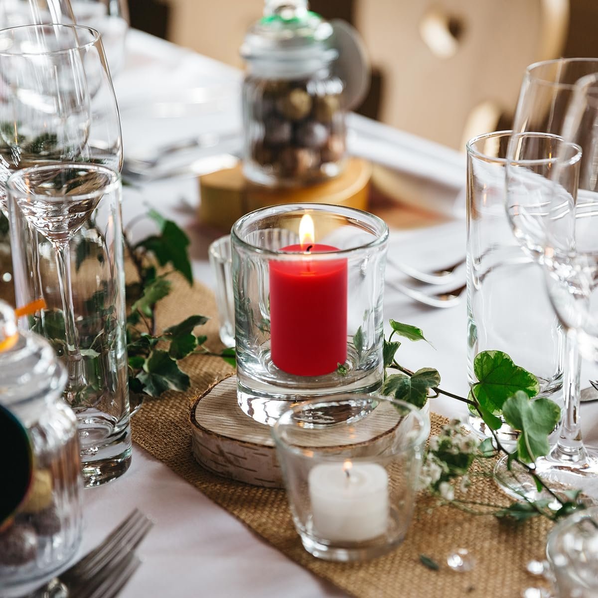 Decent Event Votives: This 1.5 inch diameter red votive candles give off a great ambiance for mood lighting, great for wedding reception, Christmas Eve Luminaria display or daily dinner table.