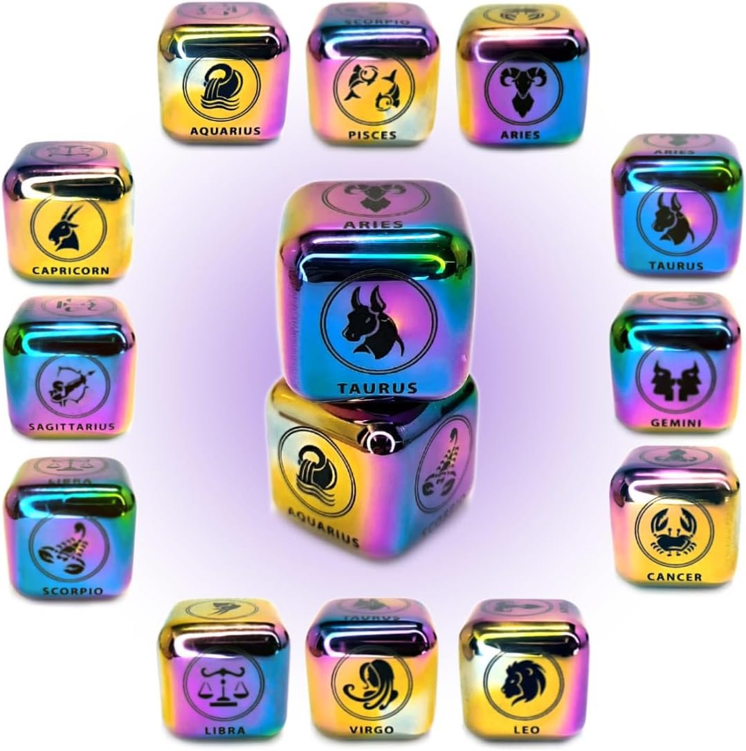Unique Zodiac Dice Set: Embark on an astrological adventure with this exceptional dice set. Each cubic die showcases one of the 12 Zodiac signs on its six faces, allowing you to explore the full spectrum of star signs with just two dice. Ideal for gaming, divination, or simply adding a cosmic touch to your daily routine.
