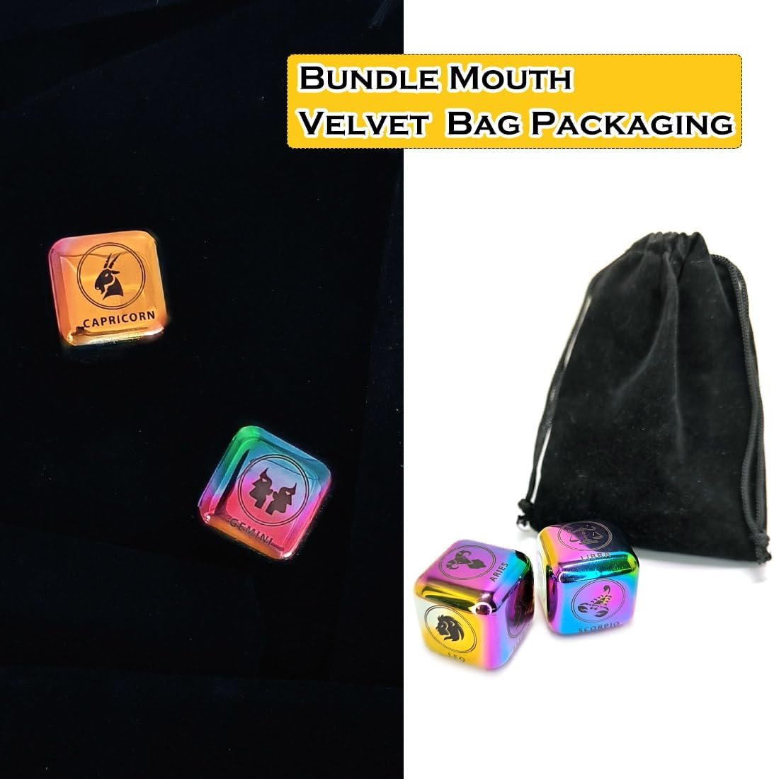 Product Name: Stainless Steel Zodiac 12 Constellation Dice Set Set Content: 2(1Pair) X 27MM Dices+1 X Bundle Mouth Linen Bag Dice Material: Stainless Steel Dice Size: 27MM(1IN)X27MM(1IN)X27MM(1IN) Engraving Technology: Precision Laser Engraving Machine Firing Embark on a journey through the cosmic wonders of the Zodiac with our exclusive Zodiac Dice Set. This unique collection of dice offers a fascinating blend of astrological charm and practical functionality. Each die in this set showcases a distinct Zodiac sign, ensuring that all 12 signs are represented with just two dice. The precision laser engraving technique captures the intricate details of each Zodiac symbol, imprinting them onto the surface of the stainless steel dice. These laser-engraved patterns are fadeless and long-lasting, ensuring that your dice will retain their beauty and readability for years to come. Crafted from premium stainless steel, these dice are both lightweight and durable. The hollow interior design ensures a comfortable grip, while the polished surface creates a mirror-like finish that elevates the dice to the level of a true work of art. Boasting a side length of 1 inch (2.7cm), these dice offer a larger display area compared to traditional dice. This increased size not only accommodates more complex patterns but also ensures that the Zodiac symbols are easily readable, making them perfect for both gaming and display purposes. Versatile and convenient, this Zodiac Dice Set is an ideal choice for astrology enthusiasts. Use it to add a cosmic touch to your gaming sessions, make predictions, or simply display it as a unique decorative accent. The included drawstring Velvet Bag provides easy storage and portability, making it a thoughtful gift for anyone who appreciates the wonders of the universe.