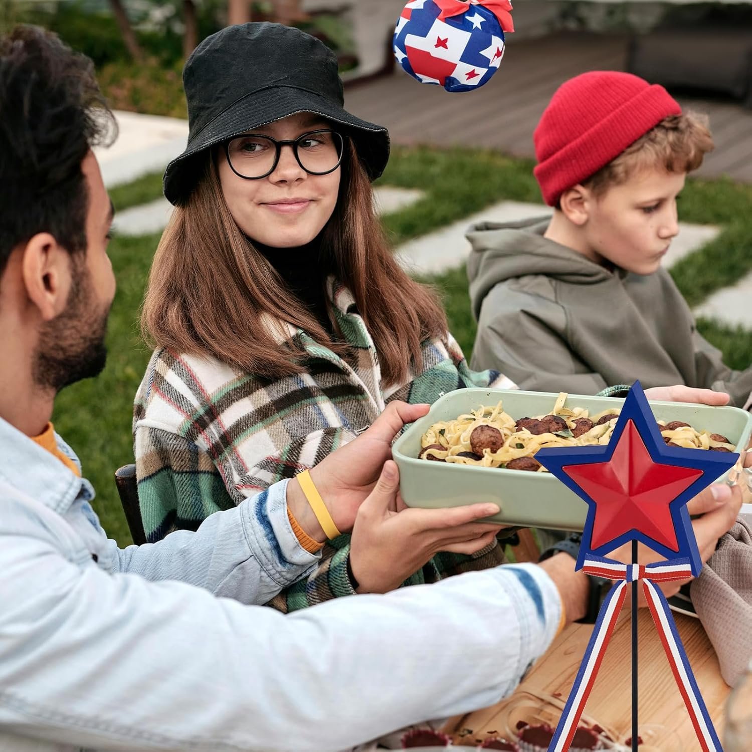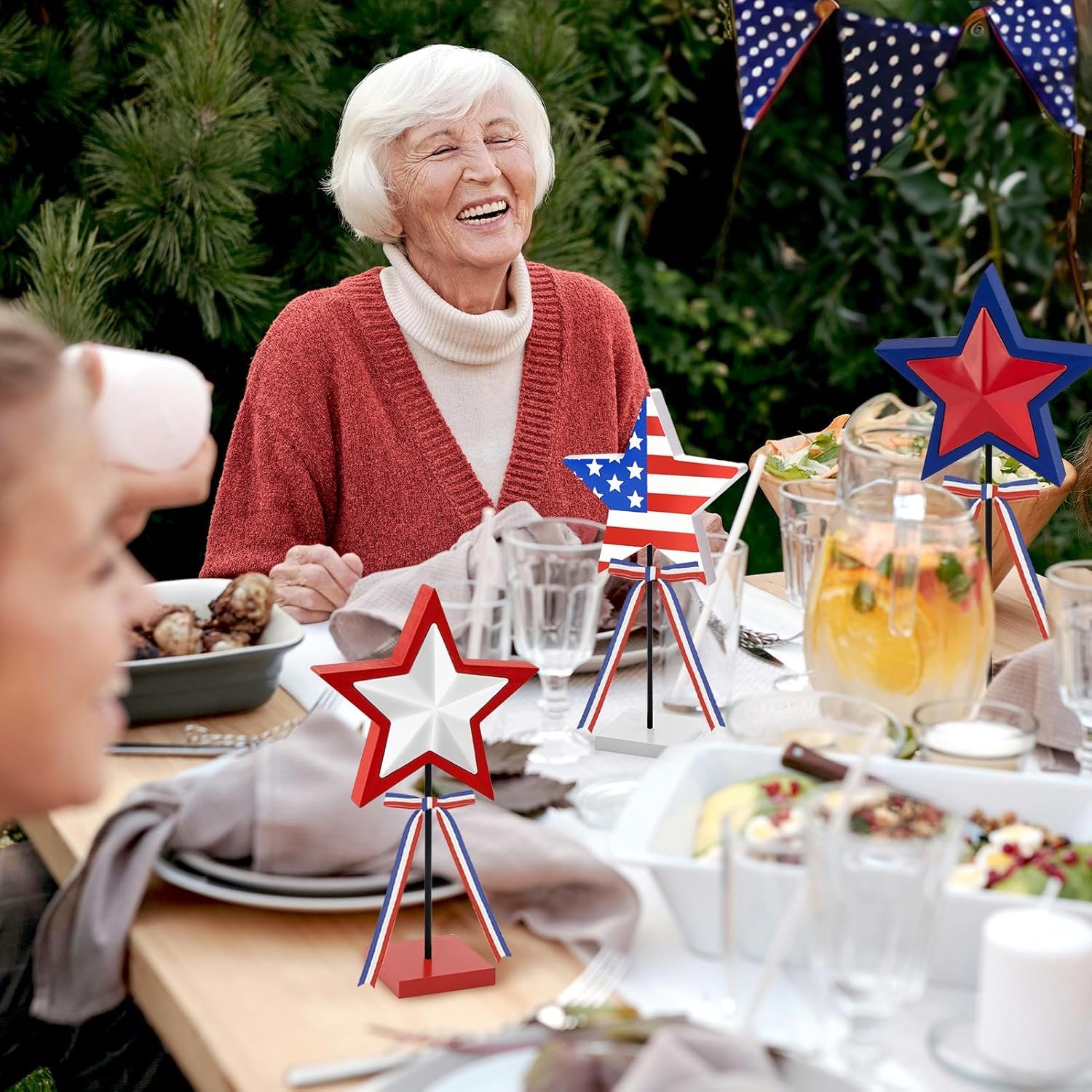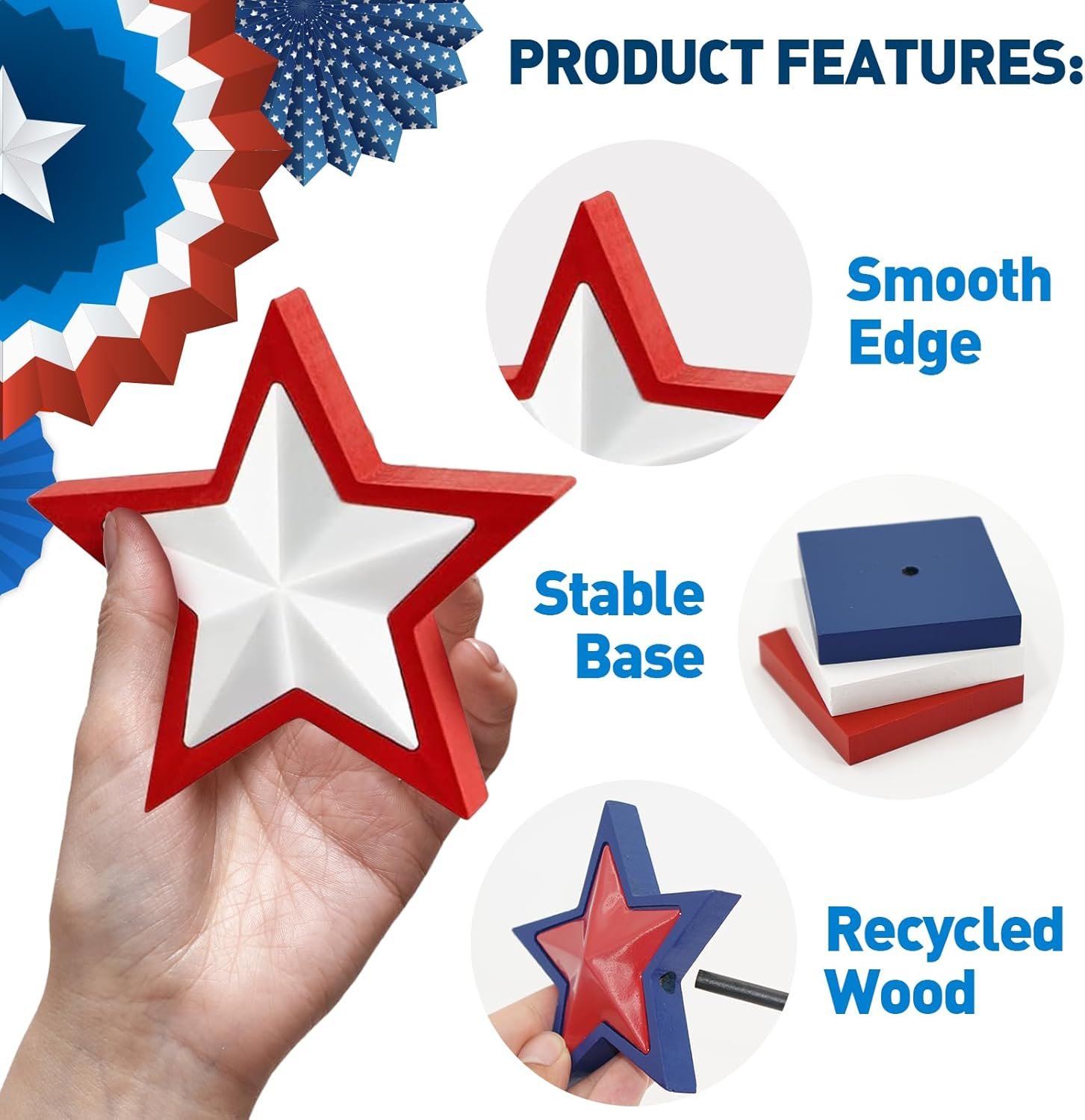 ⚪️Sturdy & Bright, Sans Glitter: Made from recycled wooden materials, our 4th of July decorations stand out with their vibrant colors. They’re built to last, ensuring your patriotic display can be a staple year after year, all without the mess of glitter.