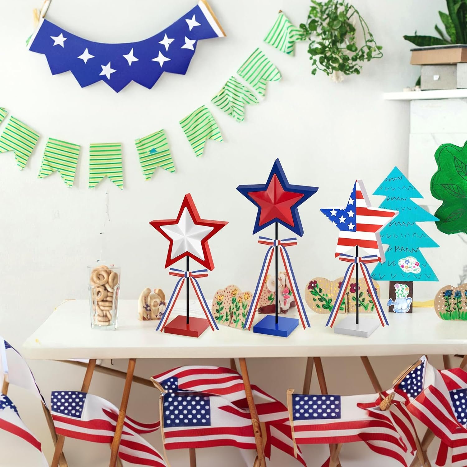 🔵Patriotism on Display: With a double-sided design in classic red, white, and blue, and topped off with a chic ribbon, these wooden stars are a proud expression of American pride. Perfect for decking out your space for Independence Day, they’re a heartfelt nod to your patriotic sentiments.