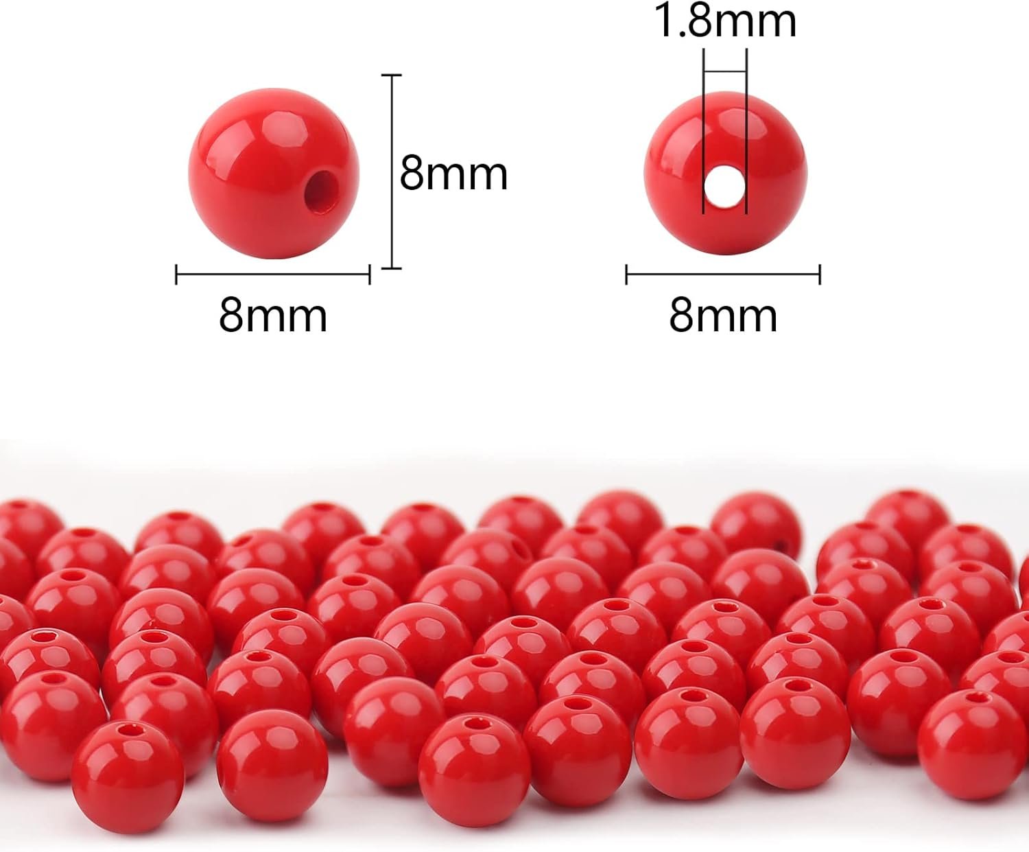 SIZE & COLOR – About 8mm in diameter, hole: 2mm. The color is Smooth Red (These acrylic beads are available in a wide assortment of vivid colors).