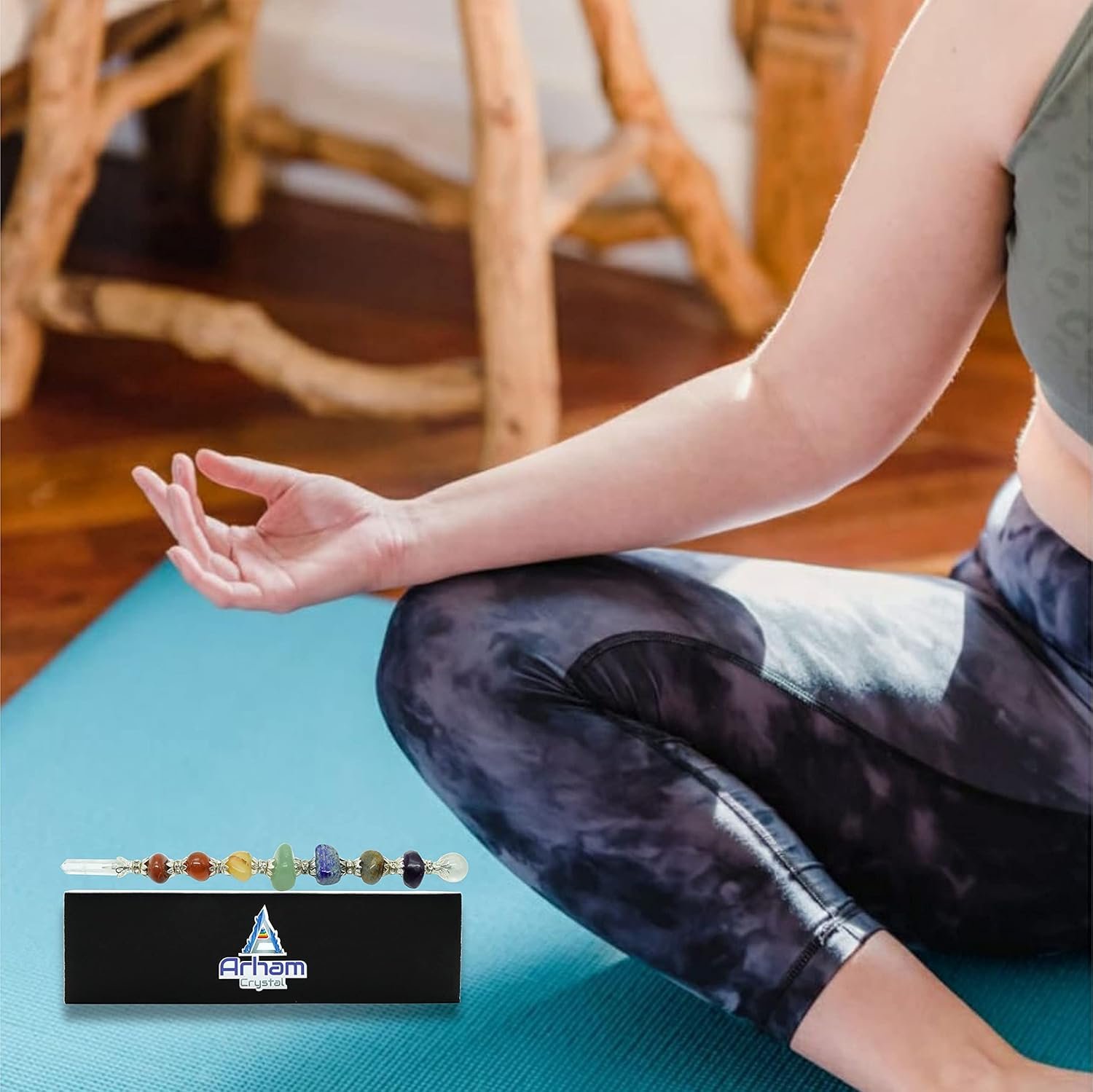 7 Chakra Tumble Wand: 8″ Long Healing Reiki Wand Stick for Healers. It is used for Reiki, Meditation, Chakra Balancing, Aura Cleansing, Positive Energy, Any Disorder, Concentration, Sound Sleep, etc.