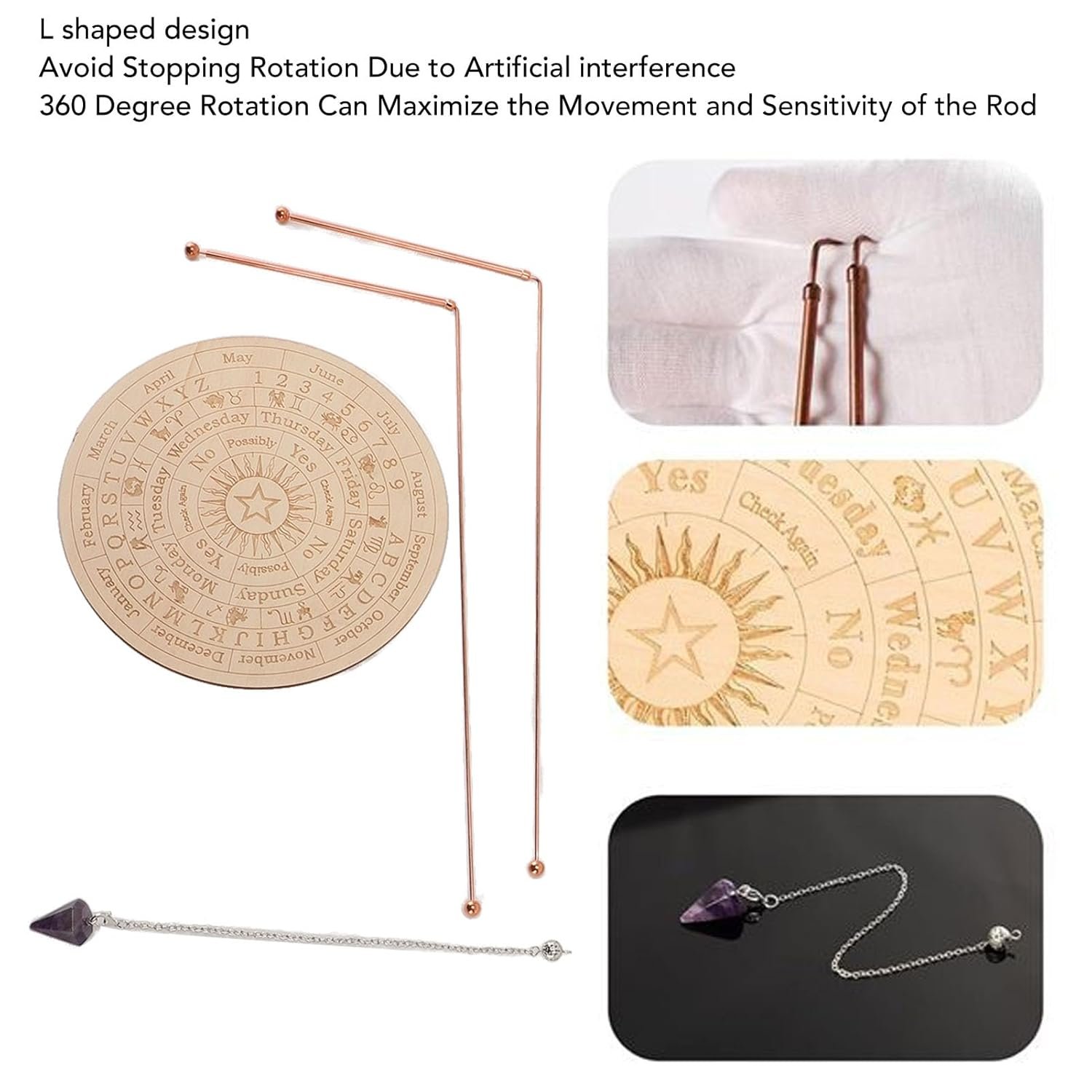 EASY TO USE: You need to think about the question you want to ask, then hold the copper rod or spirits pendulum in order to establish a connection, then hold a copper rod in each hand or lift the pendulum, keep it steady and wait for the result that the rod or pendulum points to.