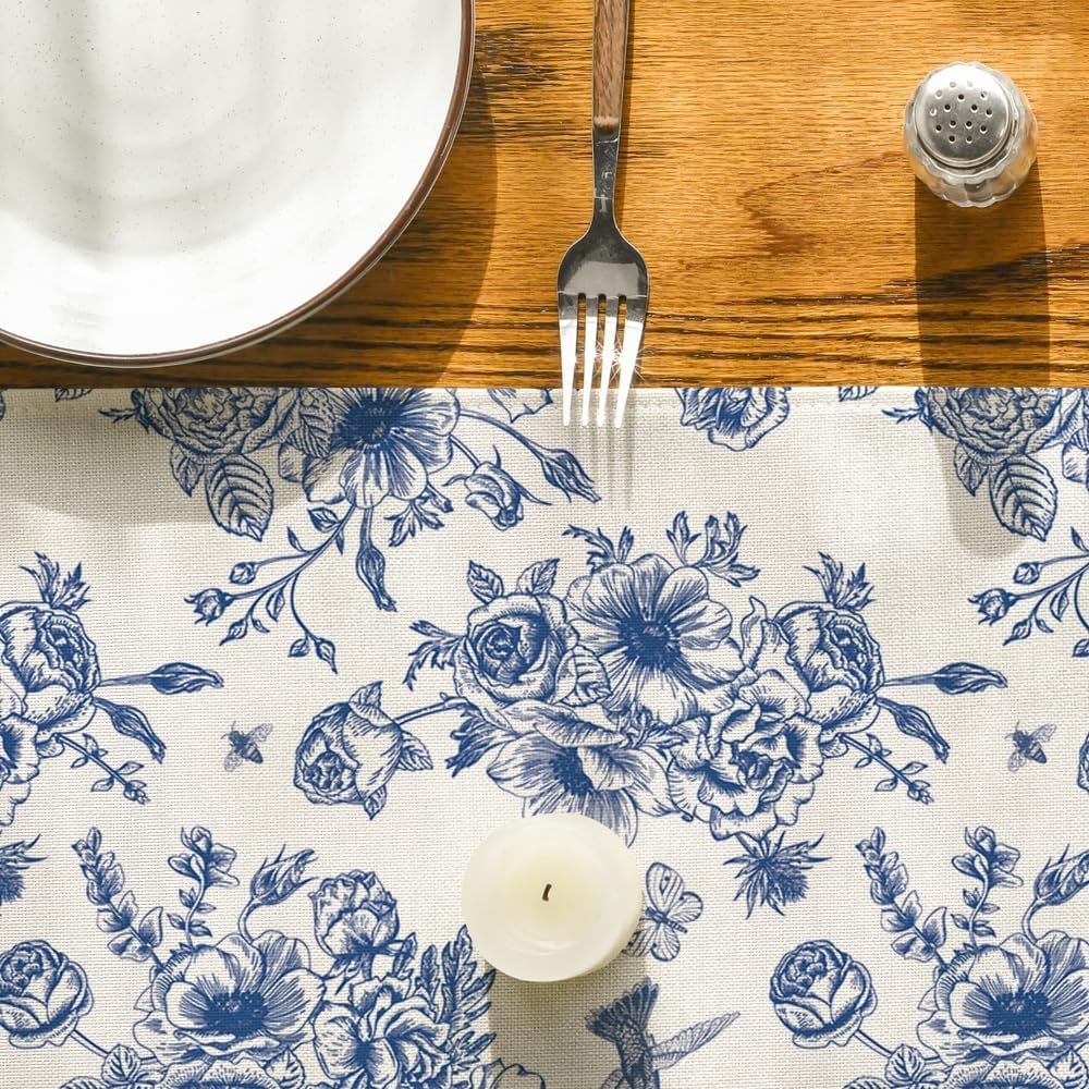 Artoid Mode Spring Navy Blue Floral Chinoiserie Table Runner, Seasonal Summer Ki…