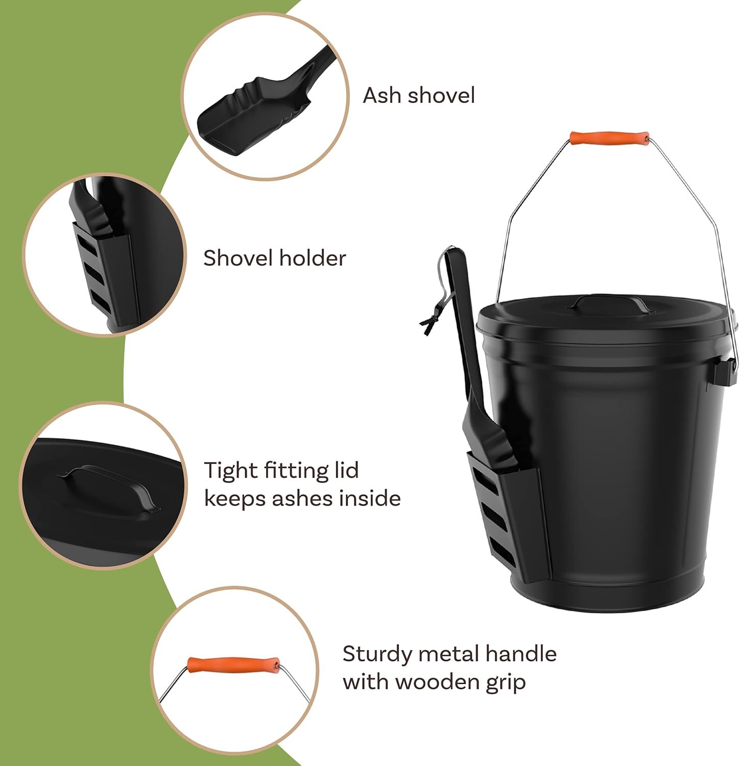 FIREPLACE ASH BUCKET – Tote hot ashes from your wood stove, fireplace, or firepit to a safe disposal spot with this metal ash bucket. The smart design with lid and shovel keeps ashes inside while in transit and enables quick, easy, and safe cleanup.