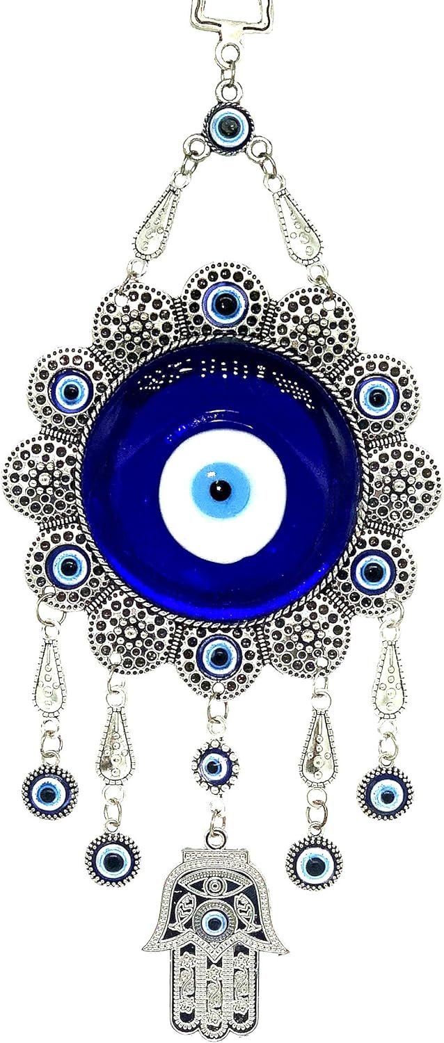 Details: Material: metal and glass Evil Eye. Total length is about 9.25″ ; Diameter of the plaque is about 4.25″