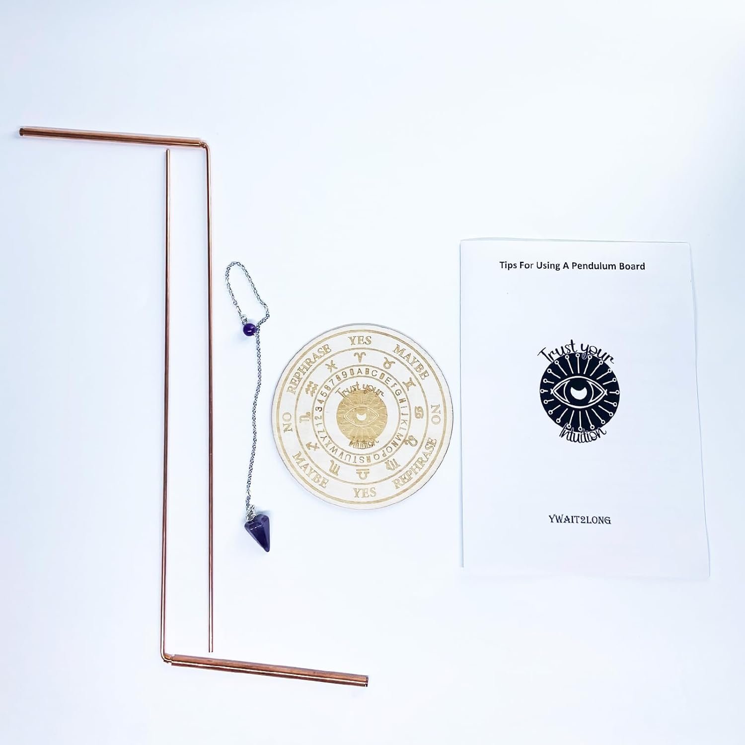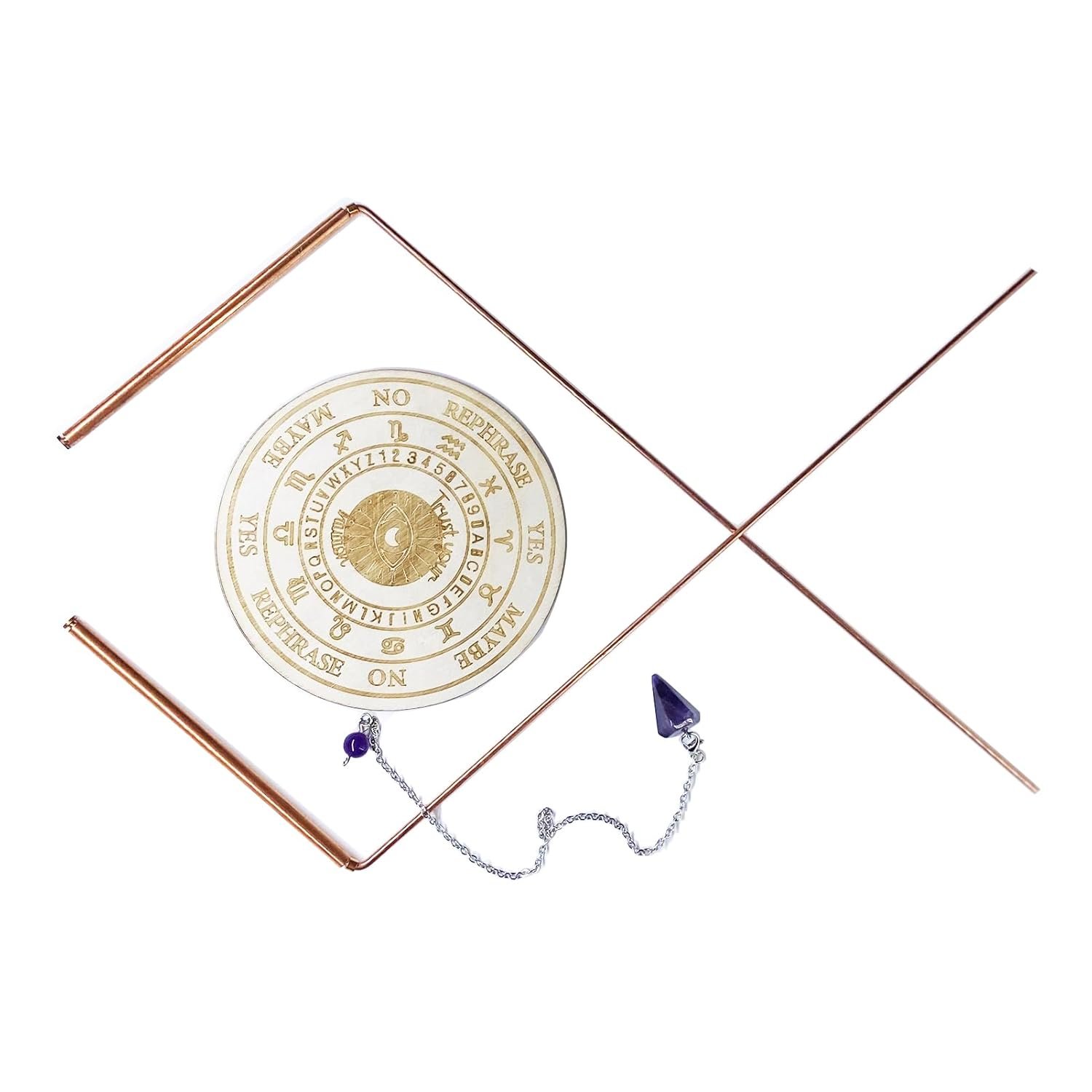 Tap into the mystical world with our Copper Dowsing Rods Spiritual & Pendulum Board Kit, complete with a board and Amethyst.