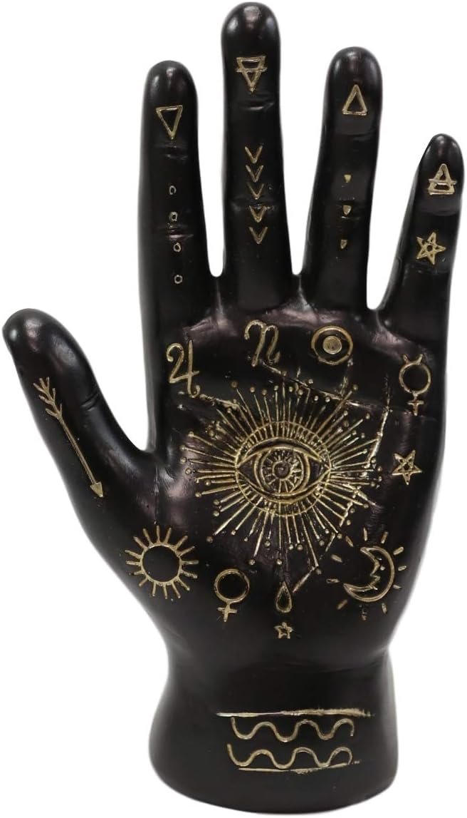 Sculpted in a manner that conjures images of readings in old French Salons, cryptic constellations, celestial symbols, ancient Hamsa religion or a hidden gypsy caravan, this Palmistry Hand is a true delight. The sculpture comes in 2 color finishes, each with different sets of symbols and words so we highly recommend collecting both! Palmistry is the characterization and foretelling by reading the lines on a persons palm. When you read the head line, heart line, life line, and more that foretell their love lives, overall health and reveal their personalities all based on the lines on their hands. The practice of Palmistry predates back to ancient times, predominantly in the Eurasian region of the world; namely the cultures of India, Nepal, Tibet, China, Persia, Sumeria, Palestine and Babylonia.