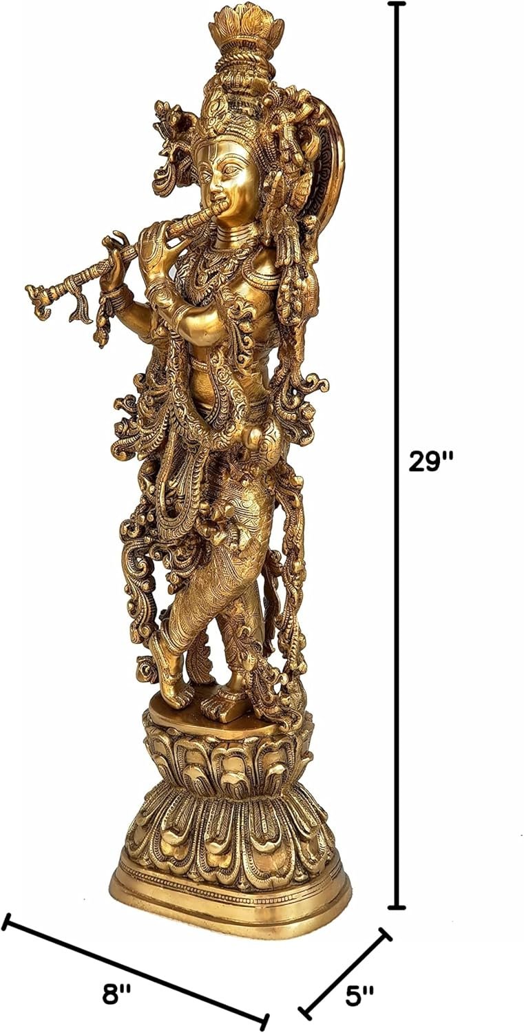Exclusive 29 inches (Very Big Size) Krishna Idol made of Brass. Ideal for Statement Decoration depicting Hindu Culture. Krishna is the only God whose Childhood, Youth, Adult all forms are worshipped which give the message of Innocence, Playfulness, Friendship, Love, Wisdom, Intelligence among several other. In Krishna, you will find a Friend, a God, a Small Child and a Mentor. He gives us life’s purpose through the Holy Bhagavad Gita. The stories of Krishna appear across a broad spectrum of Hindu philosophical and theological traditions. The principal scriptures discussing Krishna’s story are the Mahabharata, the Harivamsa, the Bhagavata Purana, and the Vishnu Purana. He is also called as Govinda & Gopala.