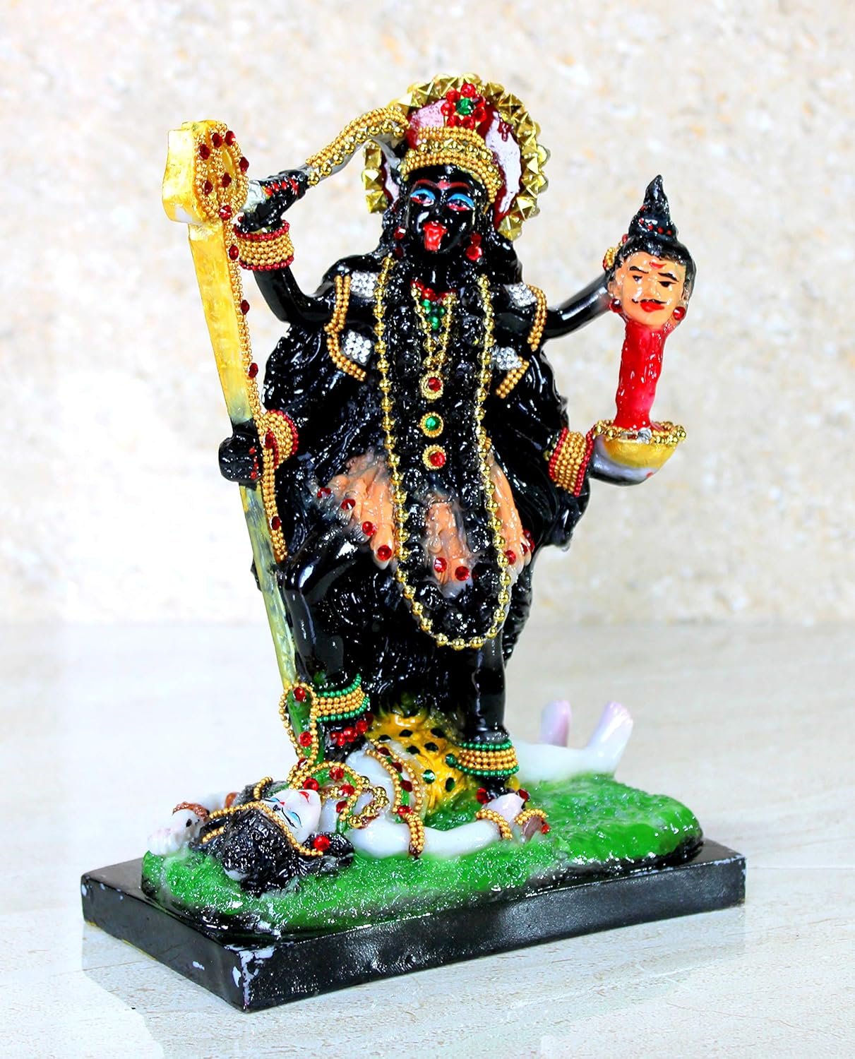 .Goddess Kali or Kali Ma is believed to win over evil. She is the avatar of Goddess Durga. She is the avatar of mother nature herself. Kali Ma is vastly worshipped. Made of good quality resin material. Decorate with lace and multi-stone.