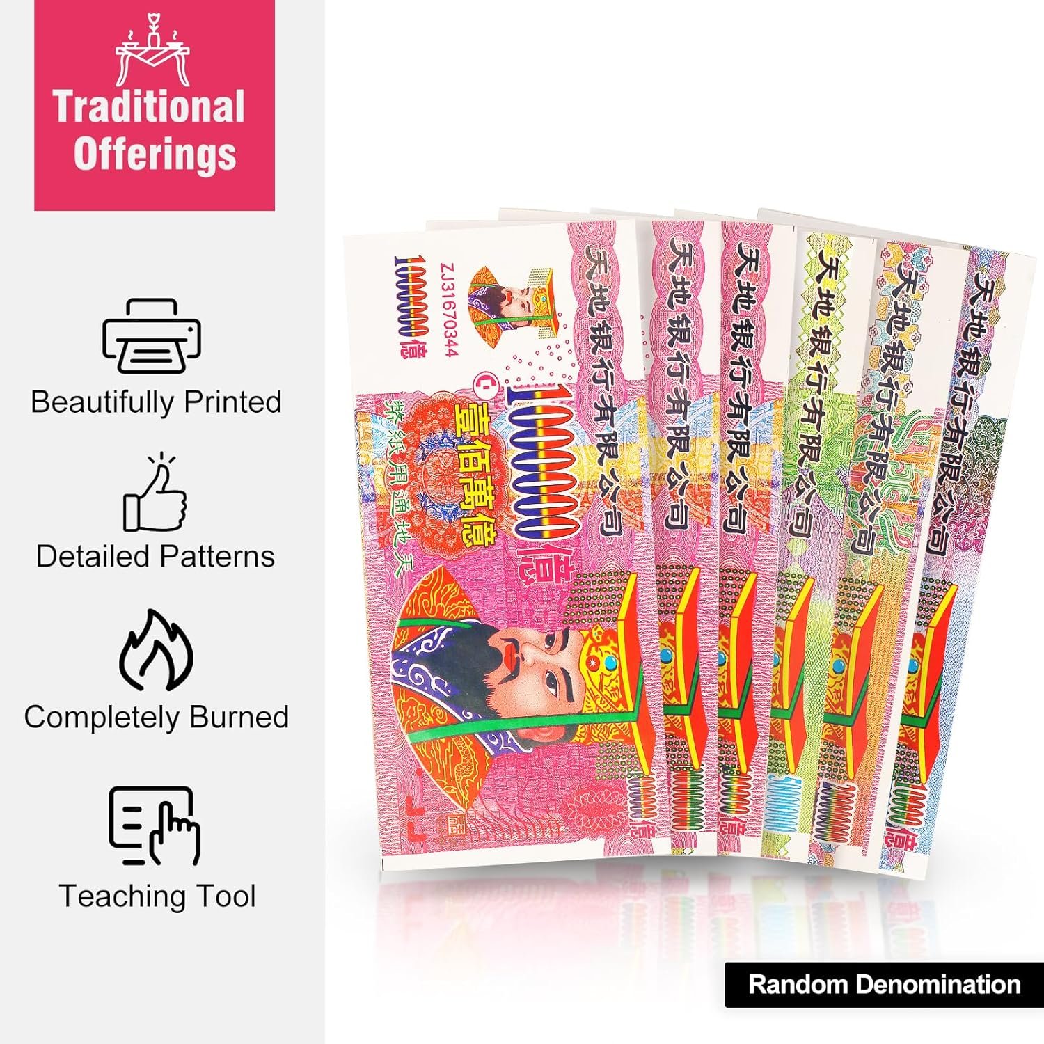 【Usage Precautions】- First, This Ancestor Money is purely symbolic and not officially recognized as a valid form of currency by any banking institution or government agency. Second, Denominations are random. Third, When burning Ancestor Money, always prioritize safety. Burn in a well-ventilated area, preferably in a metal container, and make sure the embers are completely extinguished when finished. Never leave the burning process unattended.