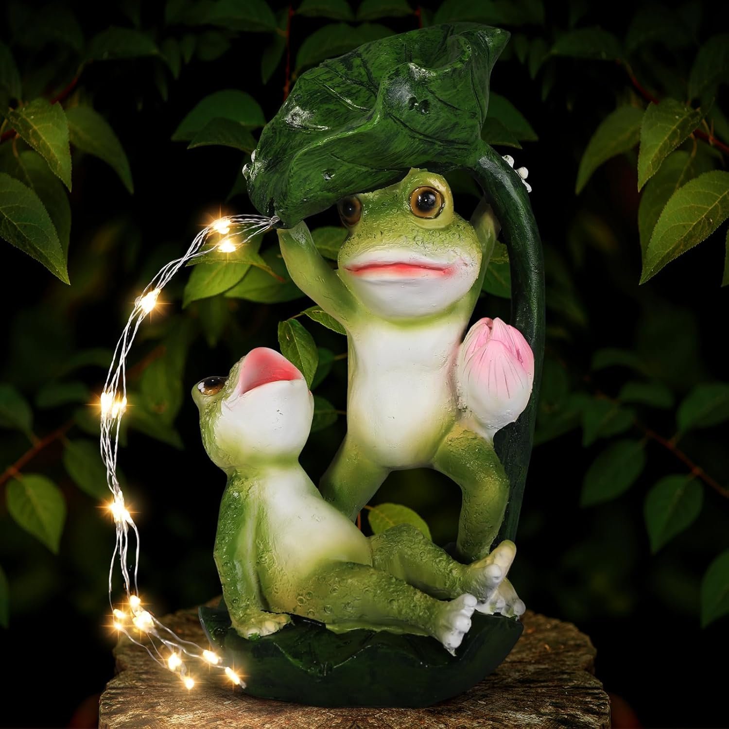 Frogs Outdoor Decor – Two frogs garden statue, a mother frog with her little frogs enjoying the lotus flowers, the light strings are like water droplets, the image is warm and vivid, illuminating the garden at night, adding a warm and interesting environment for you.