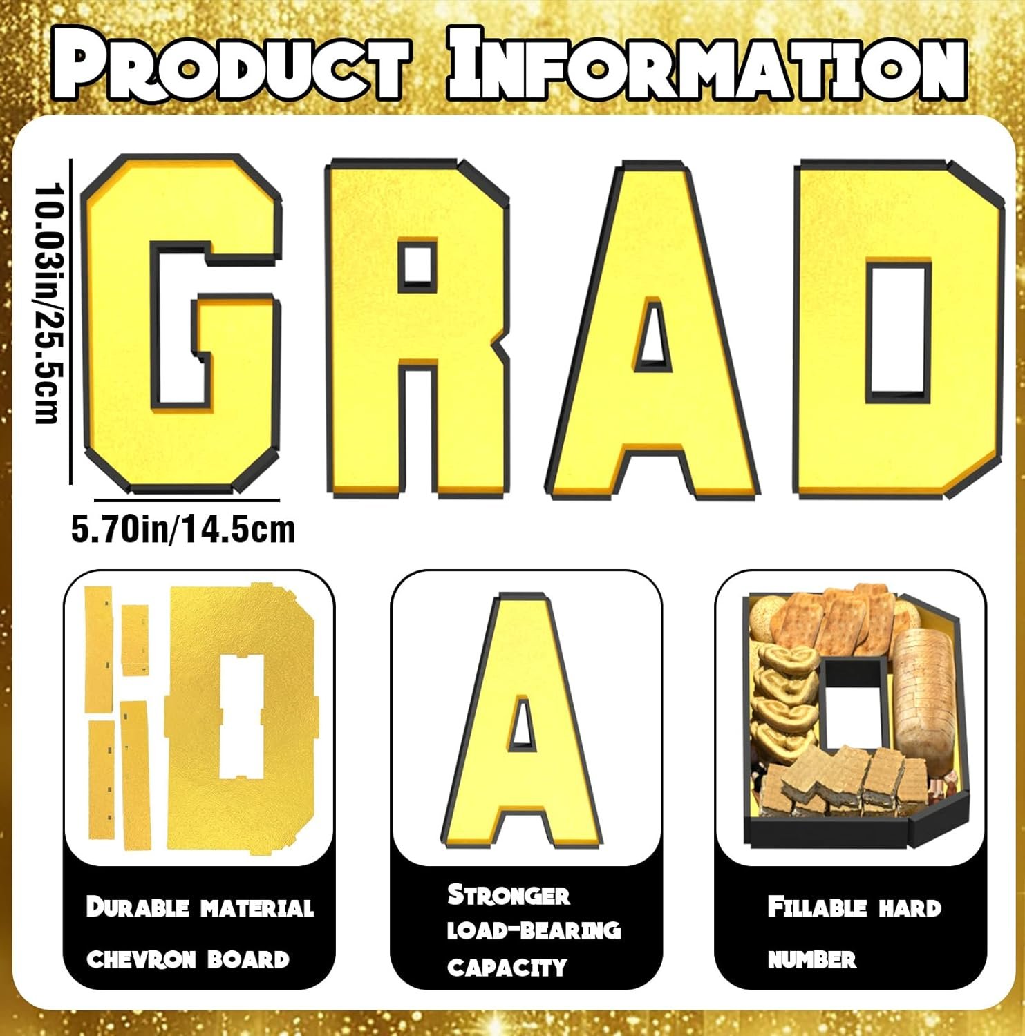 Product Included and Size: You will receive 1 set of gold fillable letters: G, R, A and D shaped boxes, each letter measures approximately 10.03×5.7 inches, perfect for graduation party decorations, definitely enhance your table ambience and impress your guests