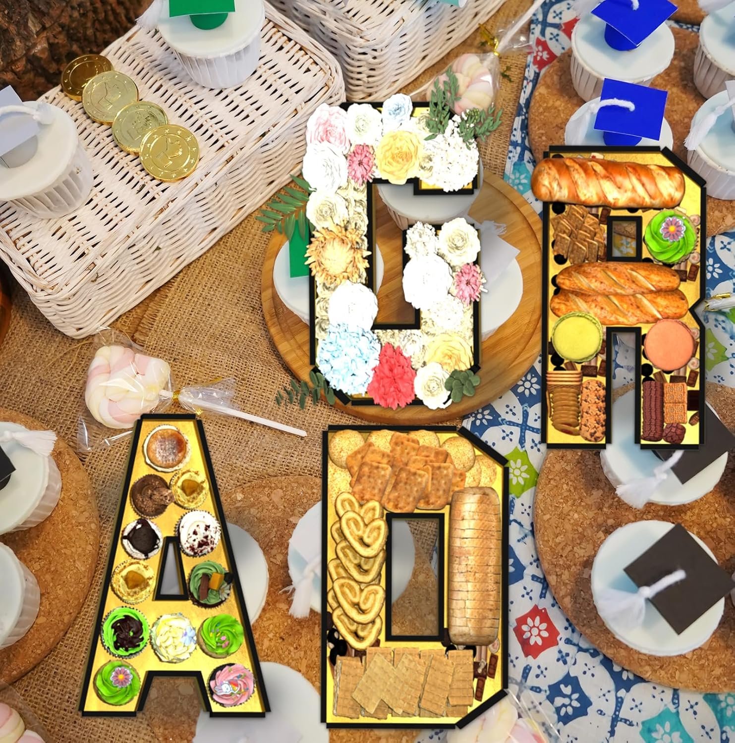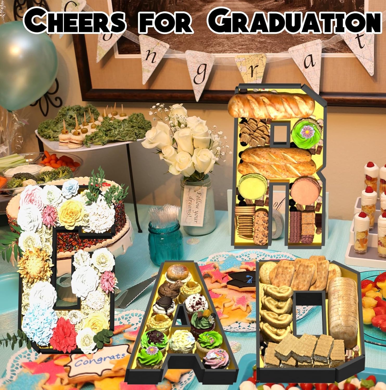 Grad Letter Design: Our grad set letter trays are designed with classic letter shape, creative and practical, suitable for placing food, fruits or flowers, making it a must-have for any graduate looking to add a touch of style to their celebration