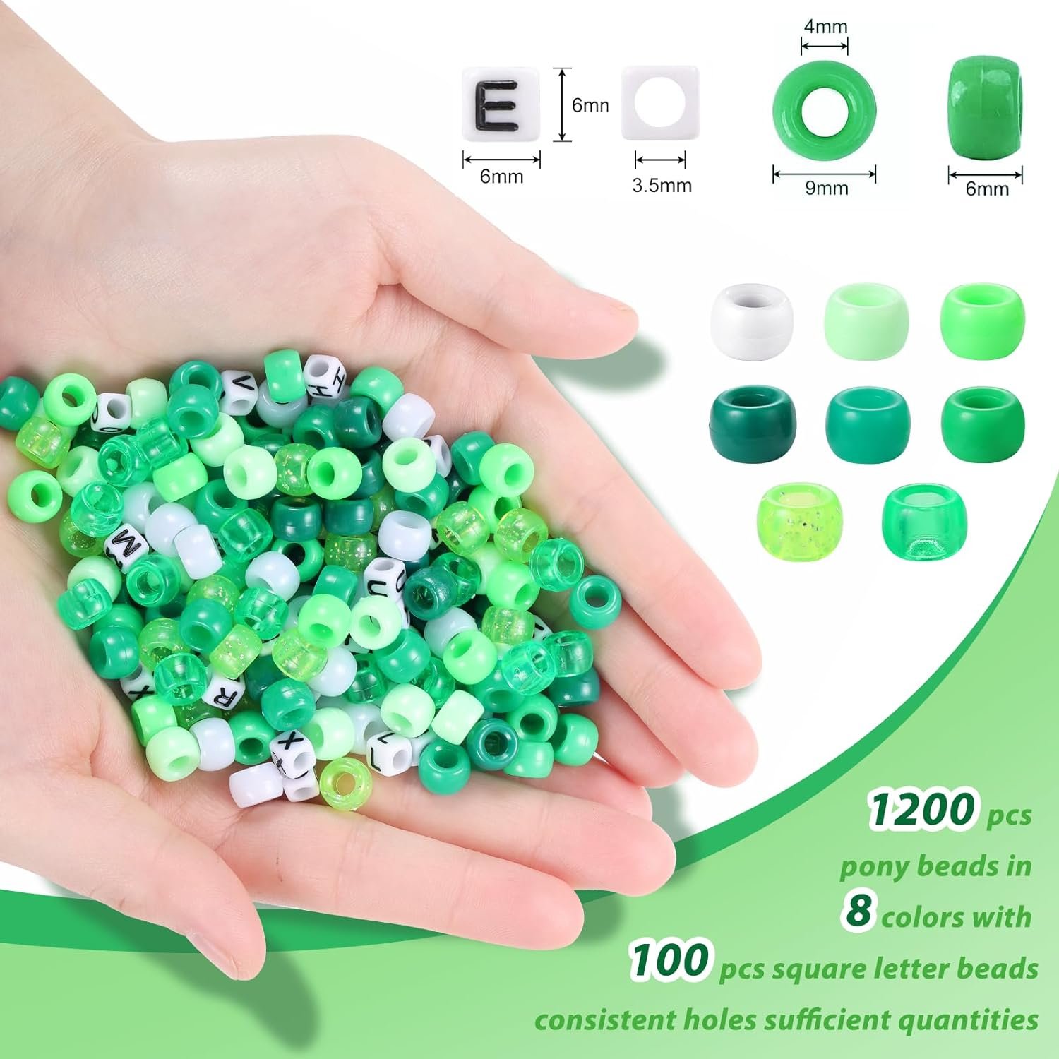 Value Pack: Including 1200pcs green pony beads in 8 colors , 100pcs Random letter beads and 1 roll of 5m elastic string (0.8mm), sufficient quantity can easily meet your needs for jewelry making and crafts.