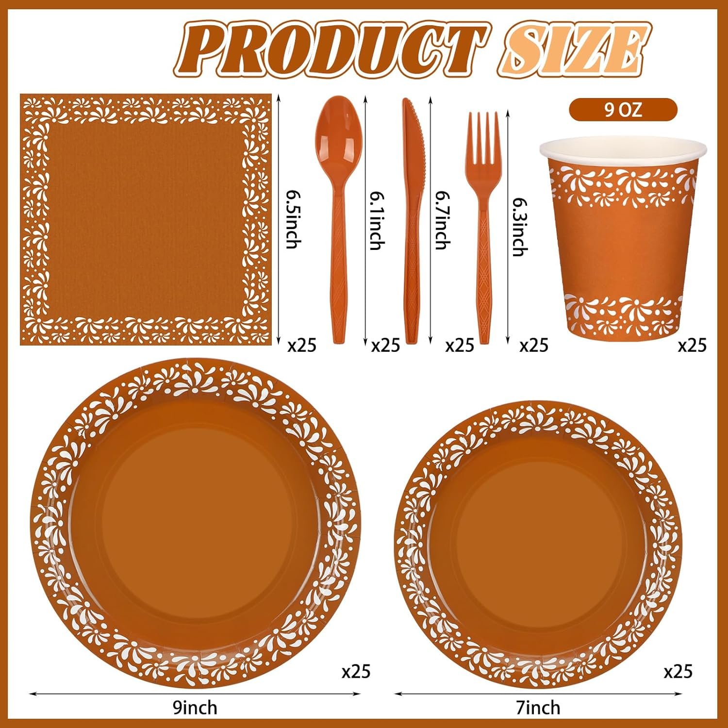 Value Pack, Meeting the Needs of Many People: one set includes 25 pieces of 9 inch Mexican paper dinner plates, 25 pieces of 7 inch festival dessert plates, 25 pieces of 9 ounce paper cups, 25 pieces of 6.5 inch Mexican party napkins, and 25 pieces of knifes forks and poons, as well as 2 tablecloths; One set can meet the needs of 25 guests, easily creating a visually stunning party table; It can be easily handled whether it’s a family gathering or a business event