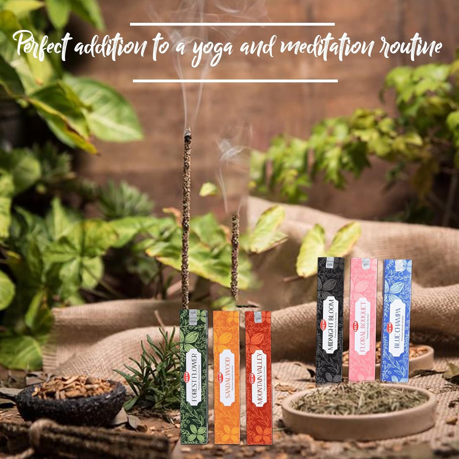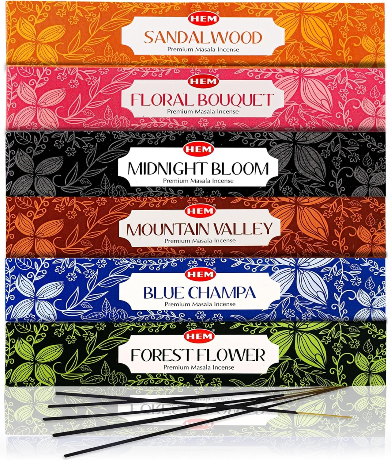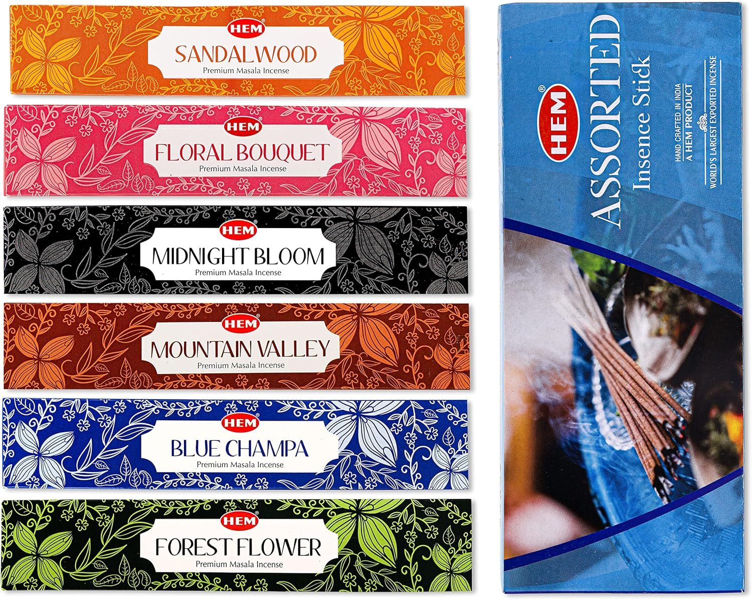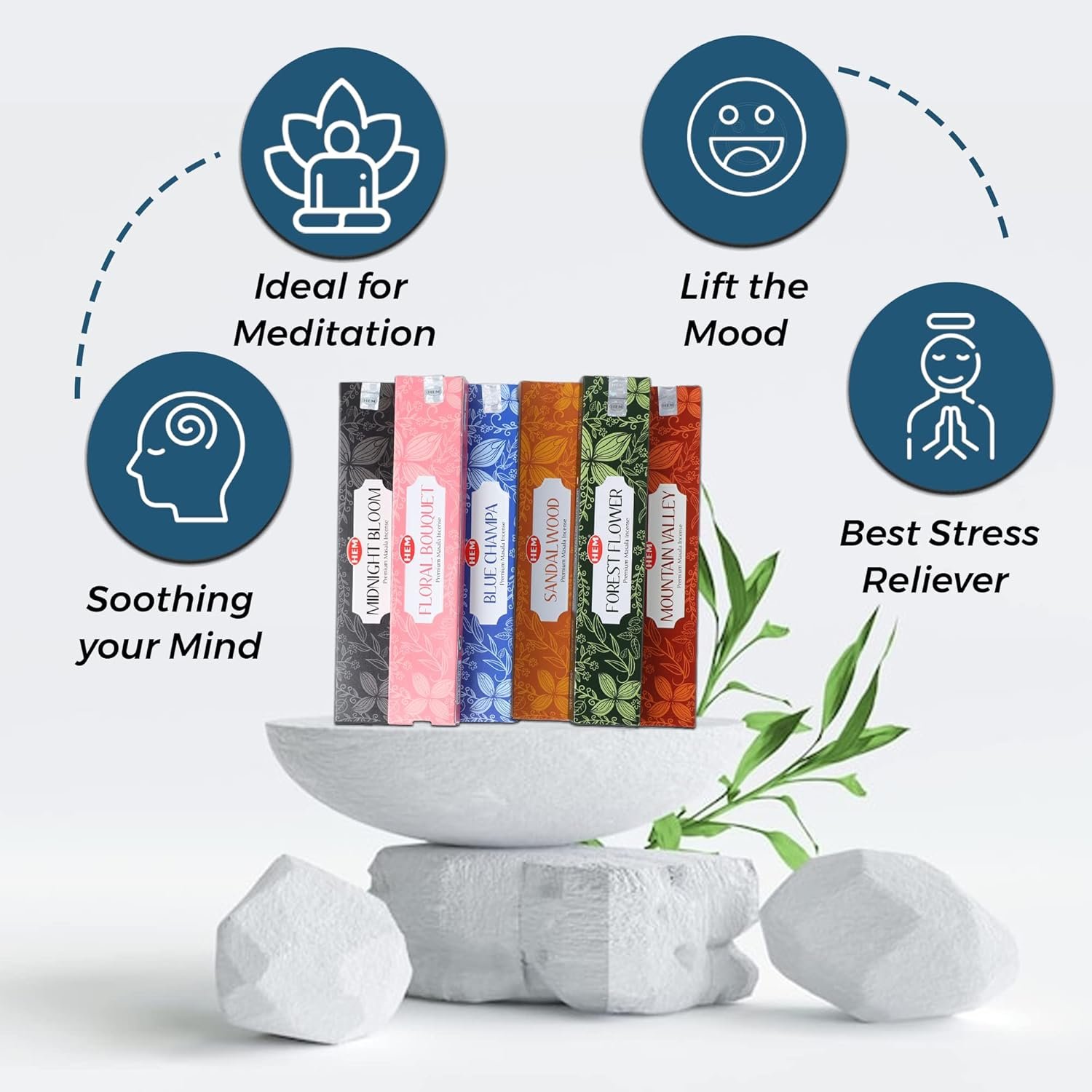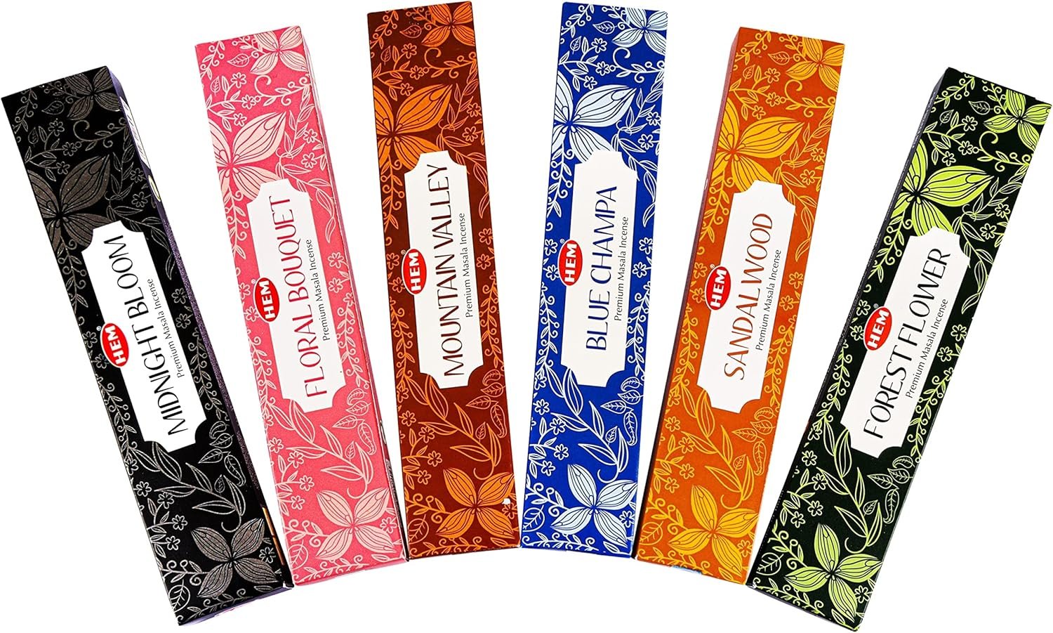 HEM ASSORTED INCENSE STICKS (Midnight Bloom, Floral Bouquet,Blue Champa, Sandalwood, Forest Flower and Mountain Valley )
