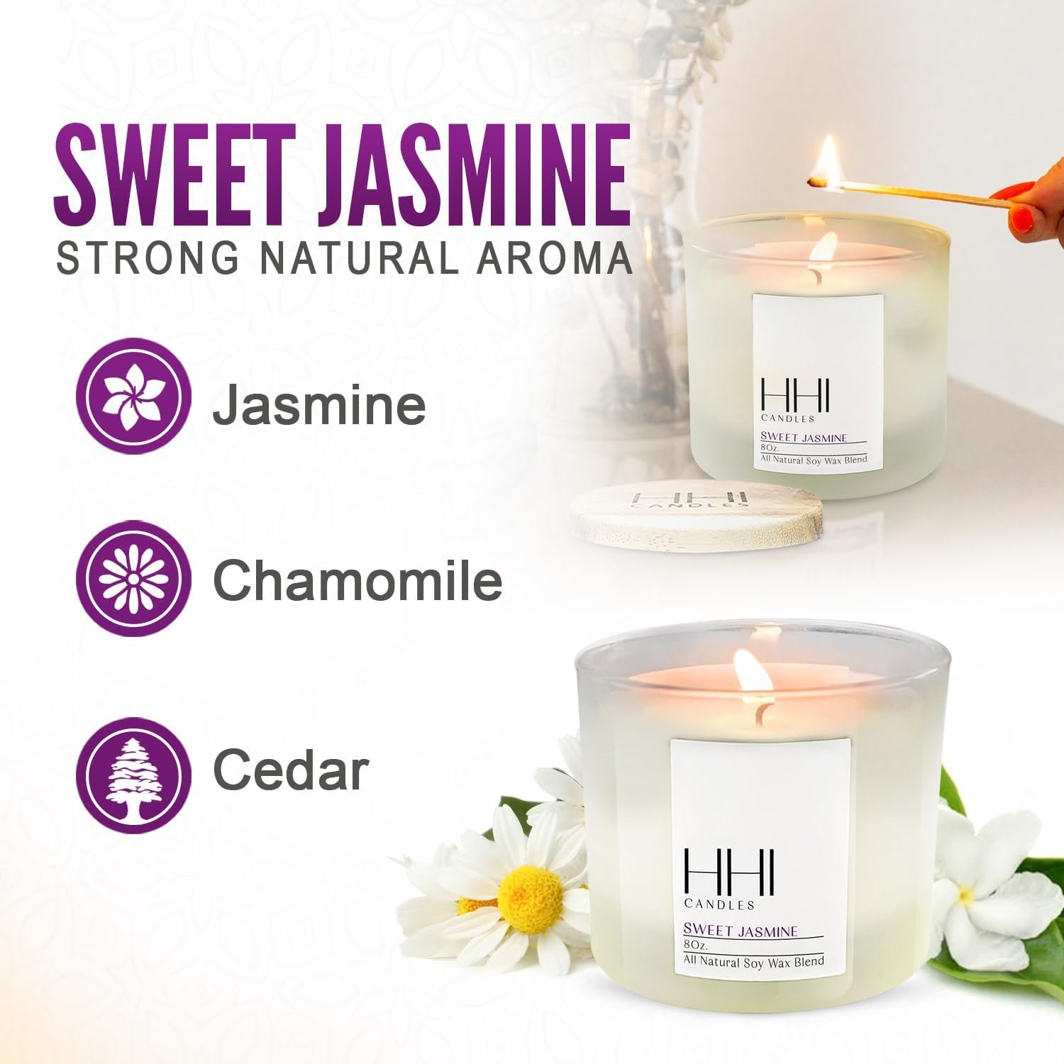 HHI Sweet Jasmine Candles are ideal for yoga, meditation, exercise, chilling out, writing, creative thinking, listening to music, drinking morning coffee, before sleeping, spa, and massage. HHI soy candles for home are long lasting with longer burning times than our competitors.