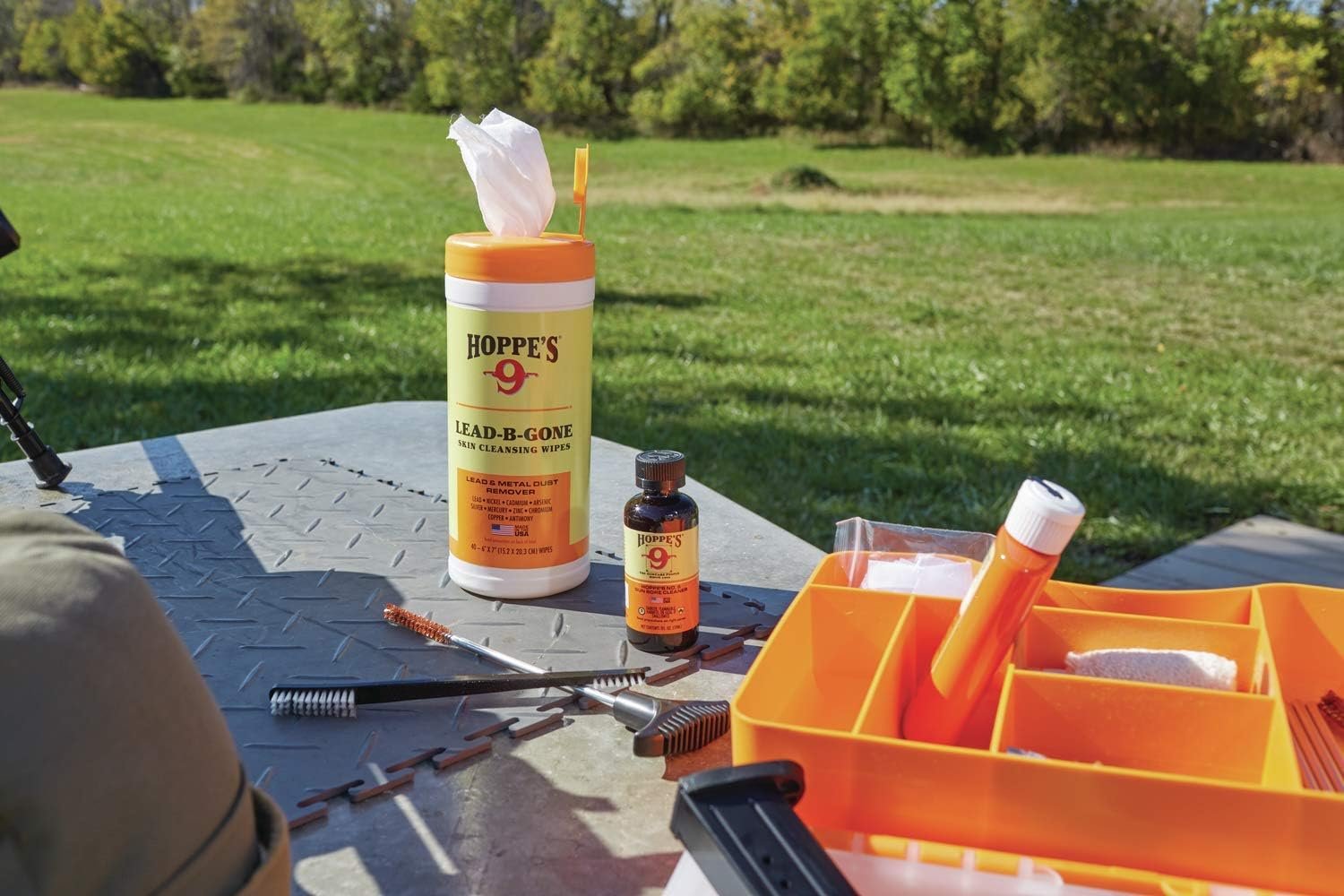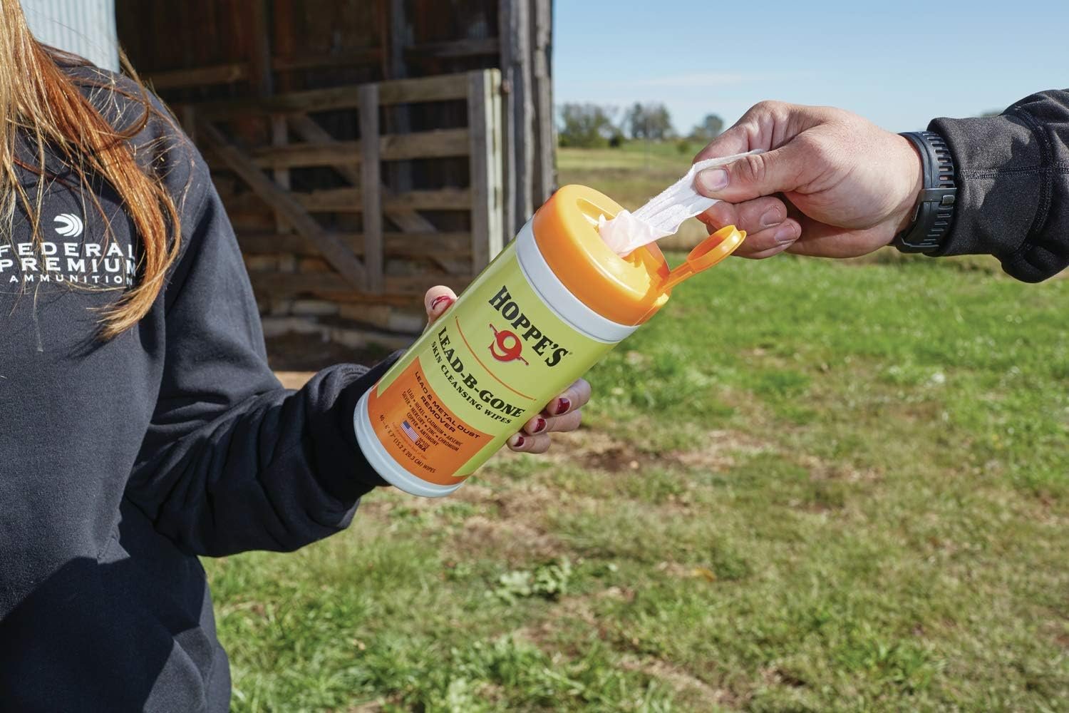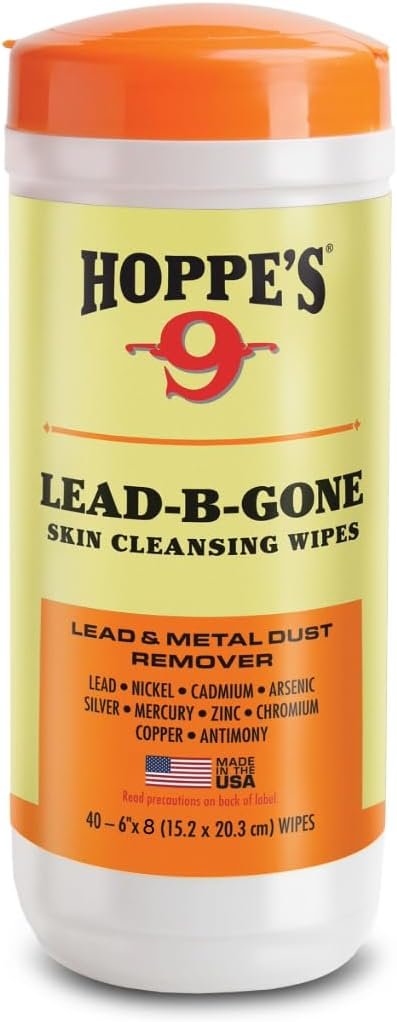 Hoppe’s Lead-B-Gone Skin Cleansing Wipes are a must-have for anyone frequently exposed to metal contaminants. These wipes are designed to efficiently lift and trap a wide range of metals, including lead, nickel, cadmium, arsenic, and more. Their formulation removes up to 99.9% of contaminants with a water rinse, far surpassing the efficacy of regular soap and water. The inclusion of gentle pH cleansers and aloe skin moisturizers ensures that while your skin is cleansed of harmful metals, it remains hydrated and free from irritation. These soft towels are perfect for cleaning your hands, arms, face, and neck, as well as any working surfaces, after activities like shooting or gun cleaning. Packaged in a convenient container, the wipes are easy to carry and use on the go. They are disposable, making clean-up quick and hassle-free. Hoppe’s Lead-B-Gone Skin Cleansing Wipes are an essential item for your shooting gear, offering both superior cleaning and skin protection.