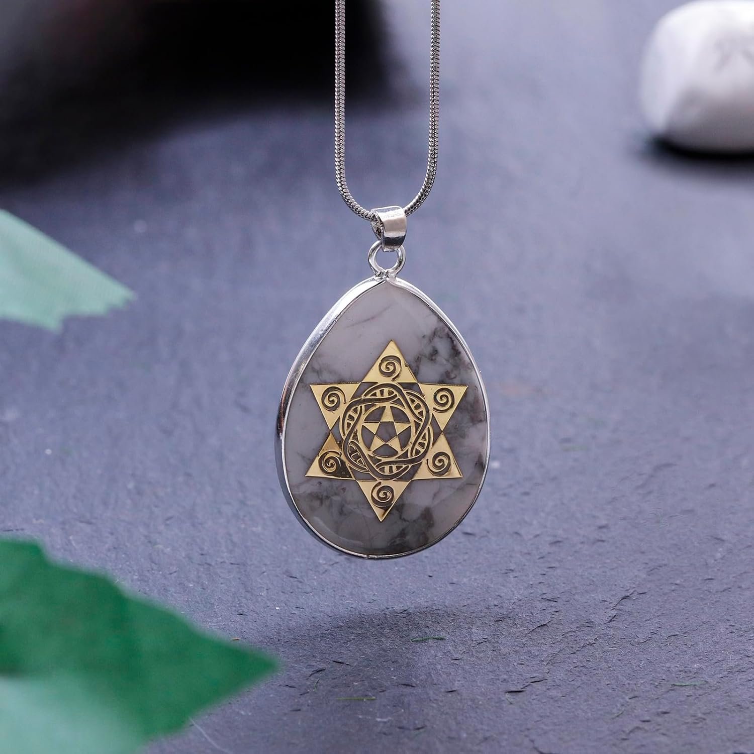 The pendant features a meticulously crafted hexagram, an ancient symbol of balance and cosmic harmony, embedded on a polished white howlite stone. Known for its calming properties, white howlite promotes inner peace and spiritual alignment.