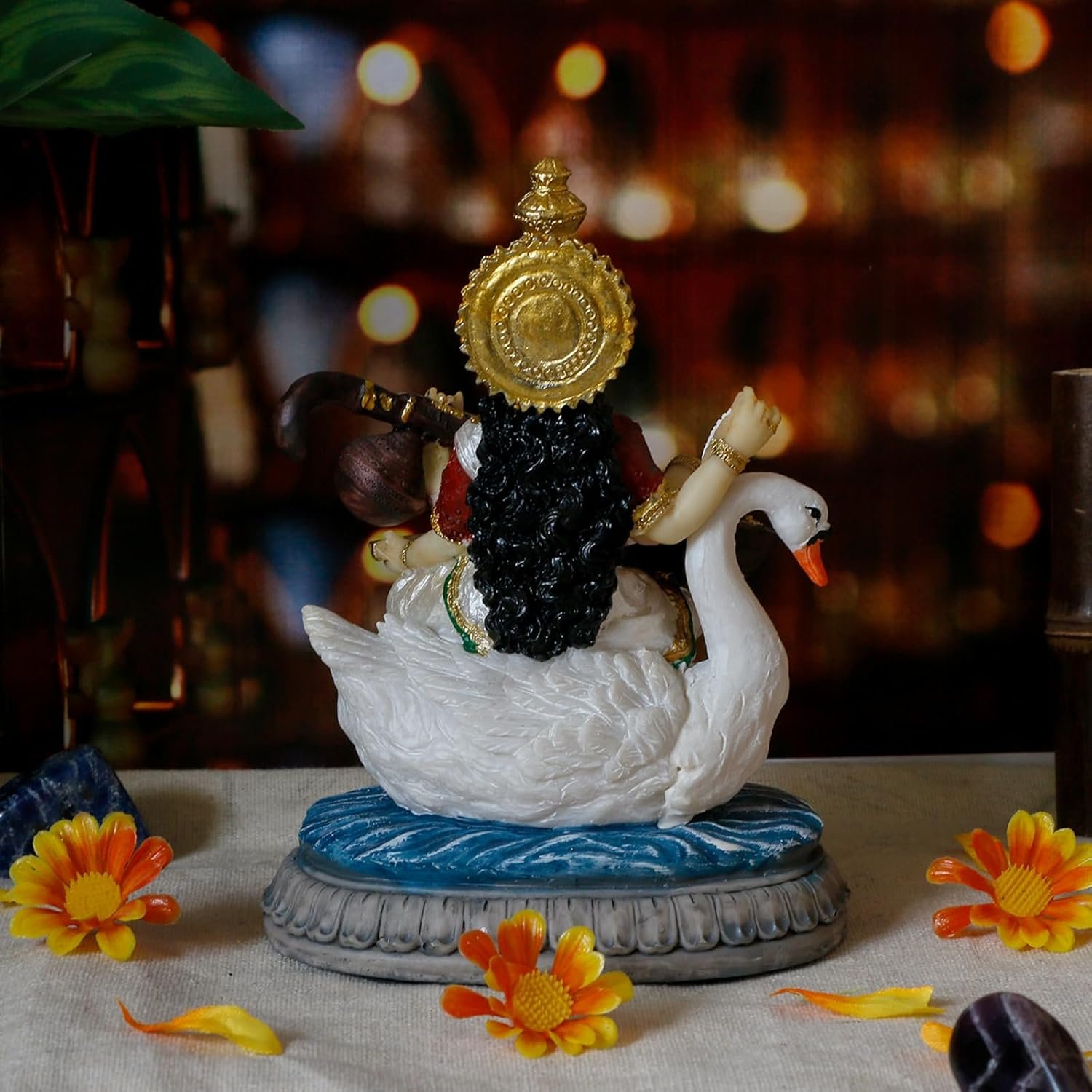 Inspired by Hindu Goddess Saraswati: Saraswati, the goddess of knowledge, music, art, wisdom, and learning, is beautifully portrayed in this statue. Her depiction seated on a swan symbolizes purity and discernment.Our Saraswati statue is designed by talented Indian artists, reflecting authentic Indian artistic traditions and craftsmanship.