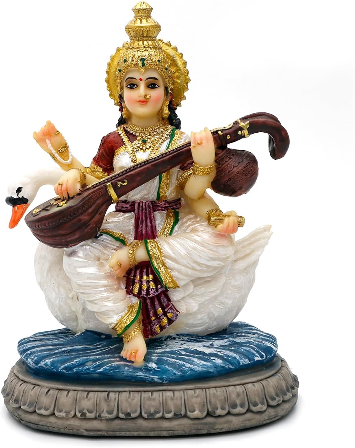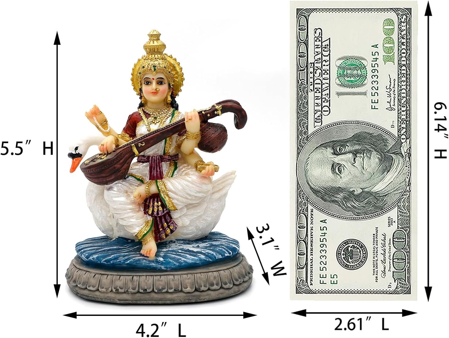 ALIKIKI 5.5”H Saraswati Sitting on Swan Playing the Vina Statue – Hindu Goddess of Music and Knowledge Sculpture