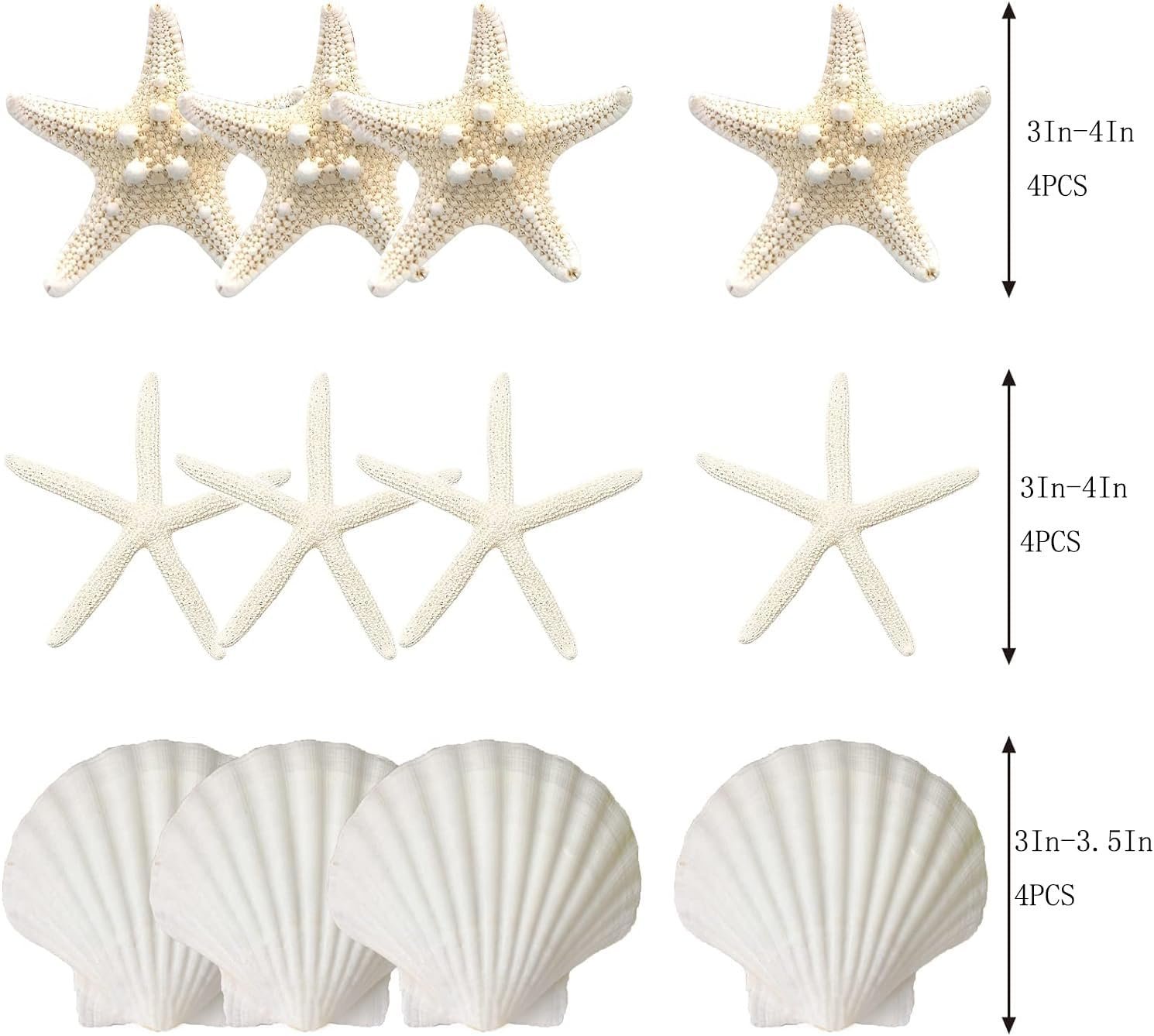 RICH MIX OF STARFISH AND SCALLOP SHELLS: these white starfish and scallop shells mixed pack consists of 4 finger starfish, 4 armored starfish and 4 scallop shells. The rich combination of three shells is just right. Individually packaged shells should not be broken to give you a better experience. Sizes ranging from 3 to 4 inches