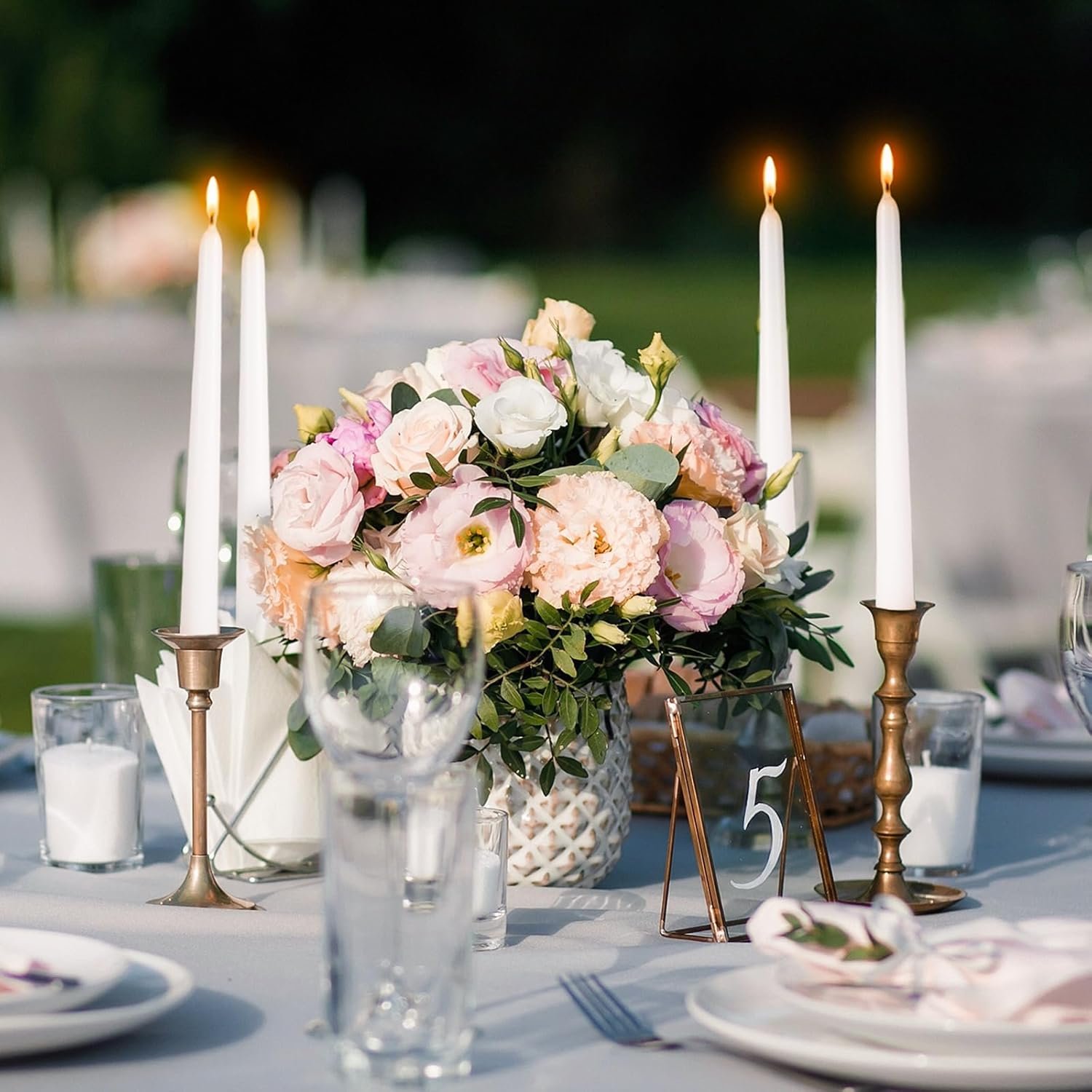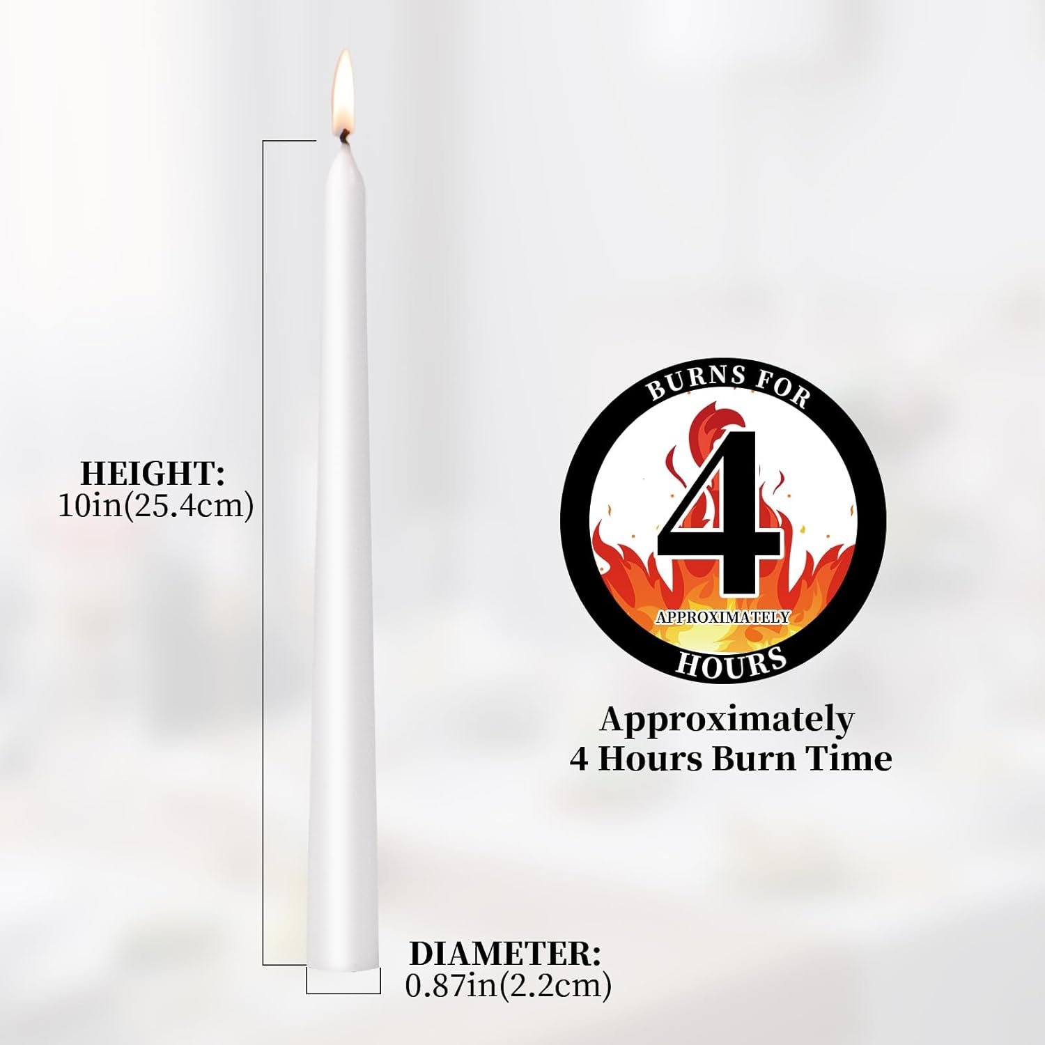 Long Burning Candles: The White Taper Candles are not just about looks – they perform well too. The burning time of each 10-inch tall taper candles is 3.5-4 hours (in a windless environment). When you look at the light of white candle sticks, you will be charmed; its straight and soft light will not leave you indifferent.