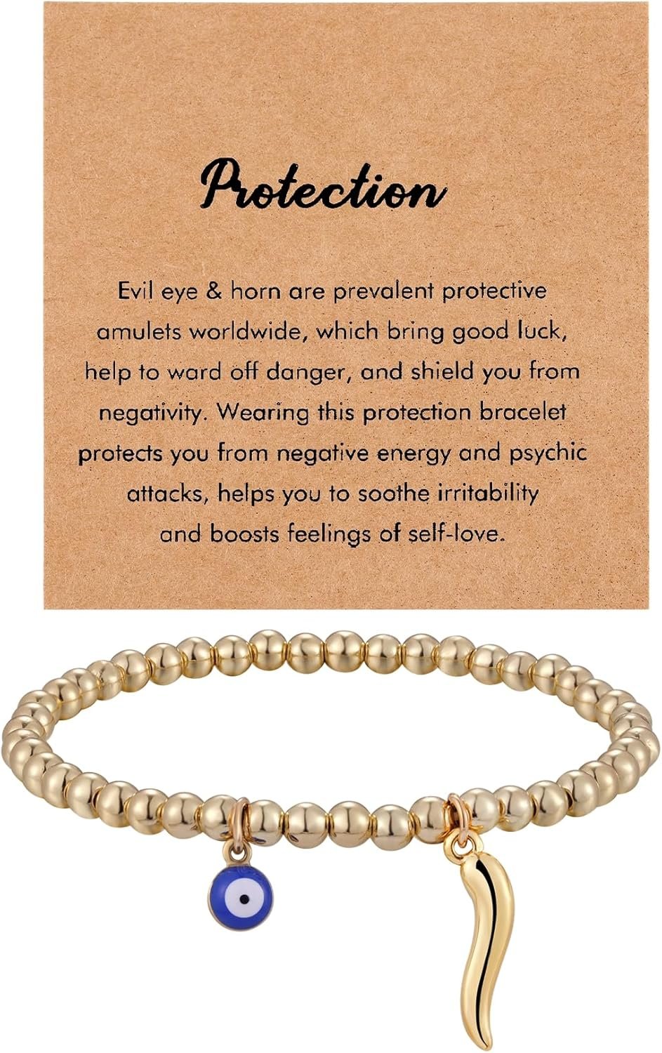“Protection. Evil eye & horn are prevalent protective amulets worldwide, which bring good luck, help to word off danger, and shield you from negativity. Wearing this protection bracelet protects you from negative energy and psychic attacks, helps you to soothe irritability and boosts feelings of self-love.”