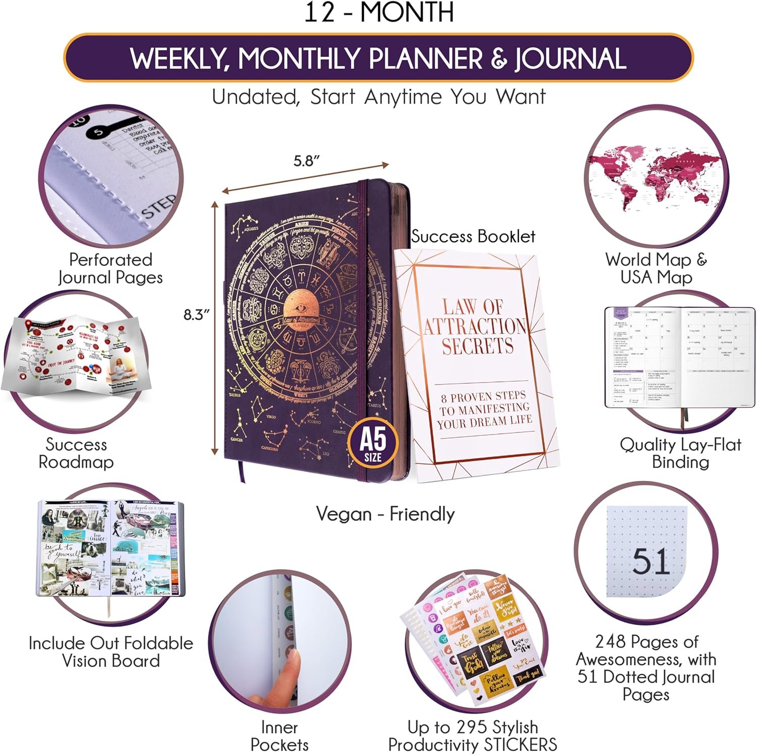 UNDATED PLANNER – All the success tools you need to create the life you always wanted. Sunday start pages, A5 Size (5.8 x 8.3 inches), thick 100 gsm paper, 248 pages of life transformation, 52 weekly, 12 monthly planning overviews & reflection, 51 dotted journal pages, habit trackers, mind maps, out foldable vision board, morning & evening routines. The planner comes with 295 productivity stickers that can be used to mark important dates, tasks, or milestones. This life planner is UNDATED giving you the freedom to start your journey whenever suits you best
