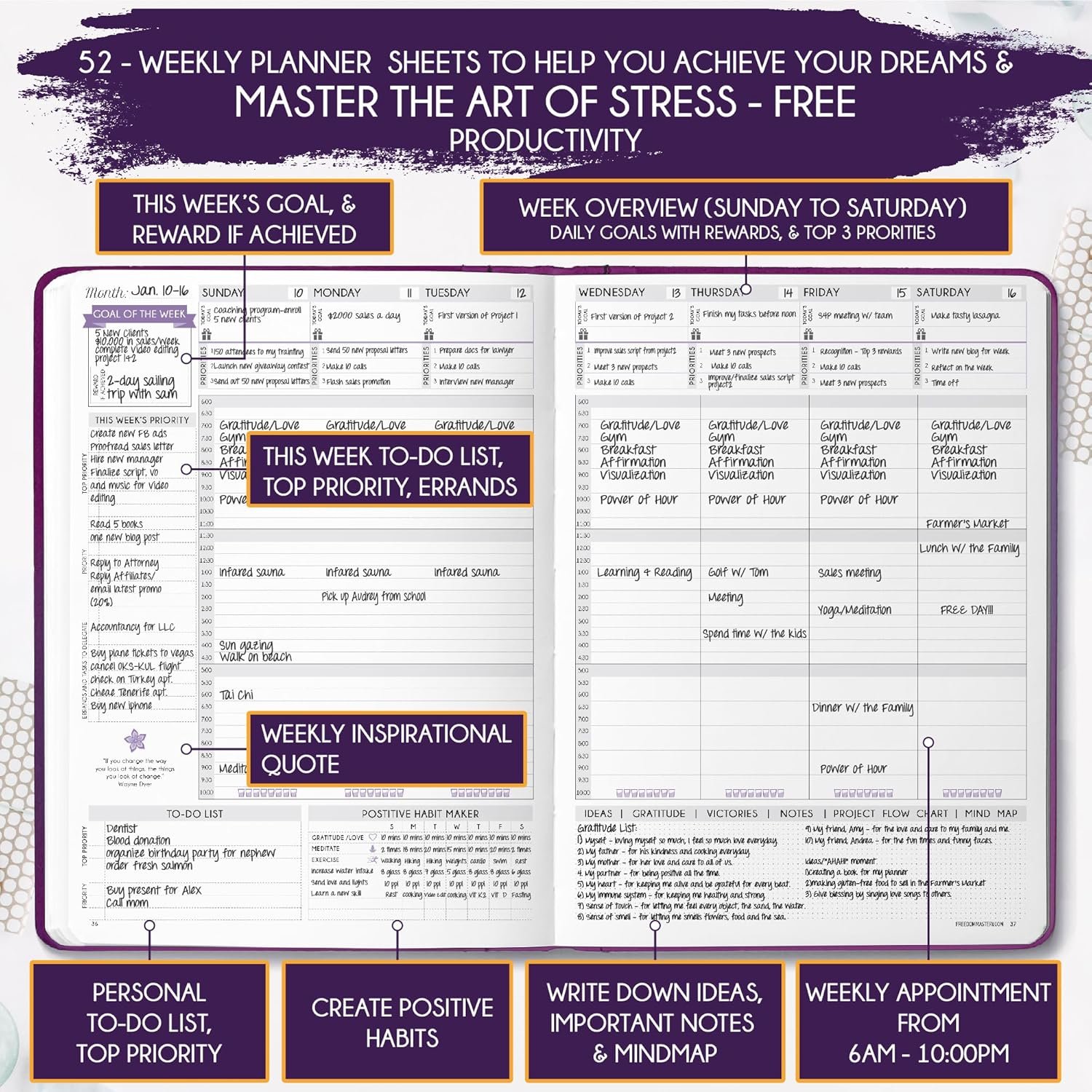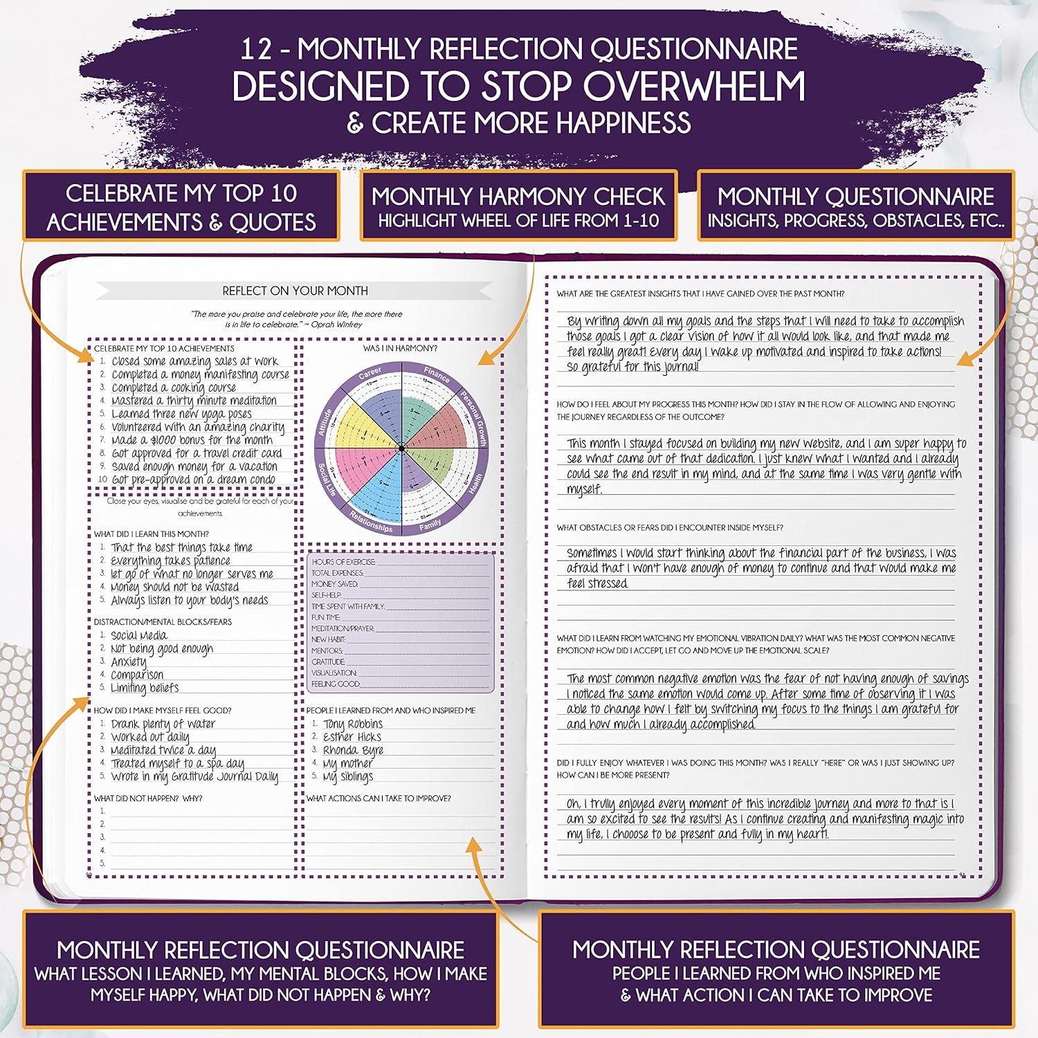 INCREASE PRODUCTIVITY AND HAPPINESS – This is a deluxe life goal planner showing you how to become the best possible version of yourself on a mental, physical & interpersonal level using the law of attraction vibration guide. This planner is a daily planner, monthly planner, weekly planner, productivity planner, goal planner, business planner, to do list planner, planner notebook & gratitude journal all-in-one.