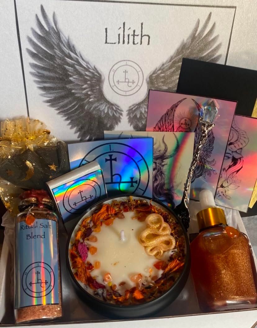 LILITH ALTAR SET, carnelians: 🖤OIL BLEND 1oz: SCENT: SULTRY FRUITY FLOWERS WITH A SWEER TWIST (inspiration, garden of eden). Infused with carnelians with gold & red cosmetic grade mica for shimmer. Wrapped carnelian bottle charm attached to 1oz glass square dropper bottle. Color fades on skin but leaves a slight shimmer. All scents are made with ALMOND OIL base carrier, cosmetic grade mica and various fragrances oil. Skin safe so you can wear, use in bath, ritual work, altar, candle refresh, anointing, etc… If wearing oils, always do a test patch. 🖤RITUAL SALT BLEND 1.35oz: orange/red ritual salt blend with red & orange flowers, fairy dust and carnelian bottle charm in 1.35oz glass jar/bottle with snake wax stamp. 🖤CRYSTAL SPOON 4.7 inches: mini spoon engraved and adorned with synthetic crystal. Spoon is alloy metal. Color tone will be picked a random (gold, brass, silver, gunmetal, copper). If you have a preference msg me for availability. 🖤3x HOLOGRAPHIC STICKER ART: 3x Holographic stickers on vinyl paper measuring 2×3. 🖤SOY CANDLE 4oz: UNSCENTED soy candle embellished with flowers and carnelian chips in a fairy circle around the wick. Although the candle is unscented, may have flower oil smell on top. Snake made of soy wax and will melt with candle. 5x INCENSE CONES: 5x charcoal incense cones hand dipped in lilith scented oil. Cones measure 2 inches and come in mini organza bags. 🖤HANDMADE PAPER PIECES: 3 small pieces homemade paper for intentions/spells, sigils, etc… (in mini envelope). 🖤BOOK OF MATCHES: Book of matches with holographic art adhered to front. Carnelian is the chosen crystal for Lilith because of its representation of fire.