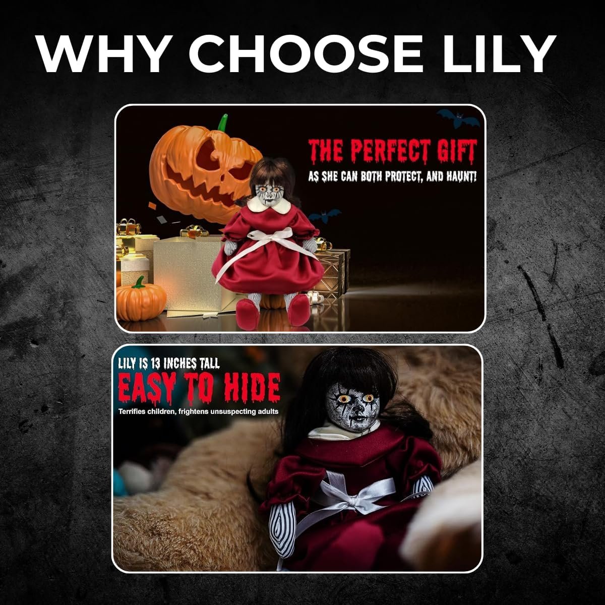 Spooky Charm: Elevate your Halloween decor with Lily, a 13-inch haunted doll that brings an eerie ambiance to any space.