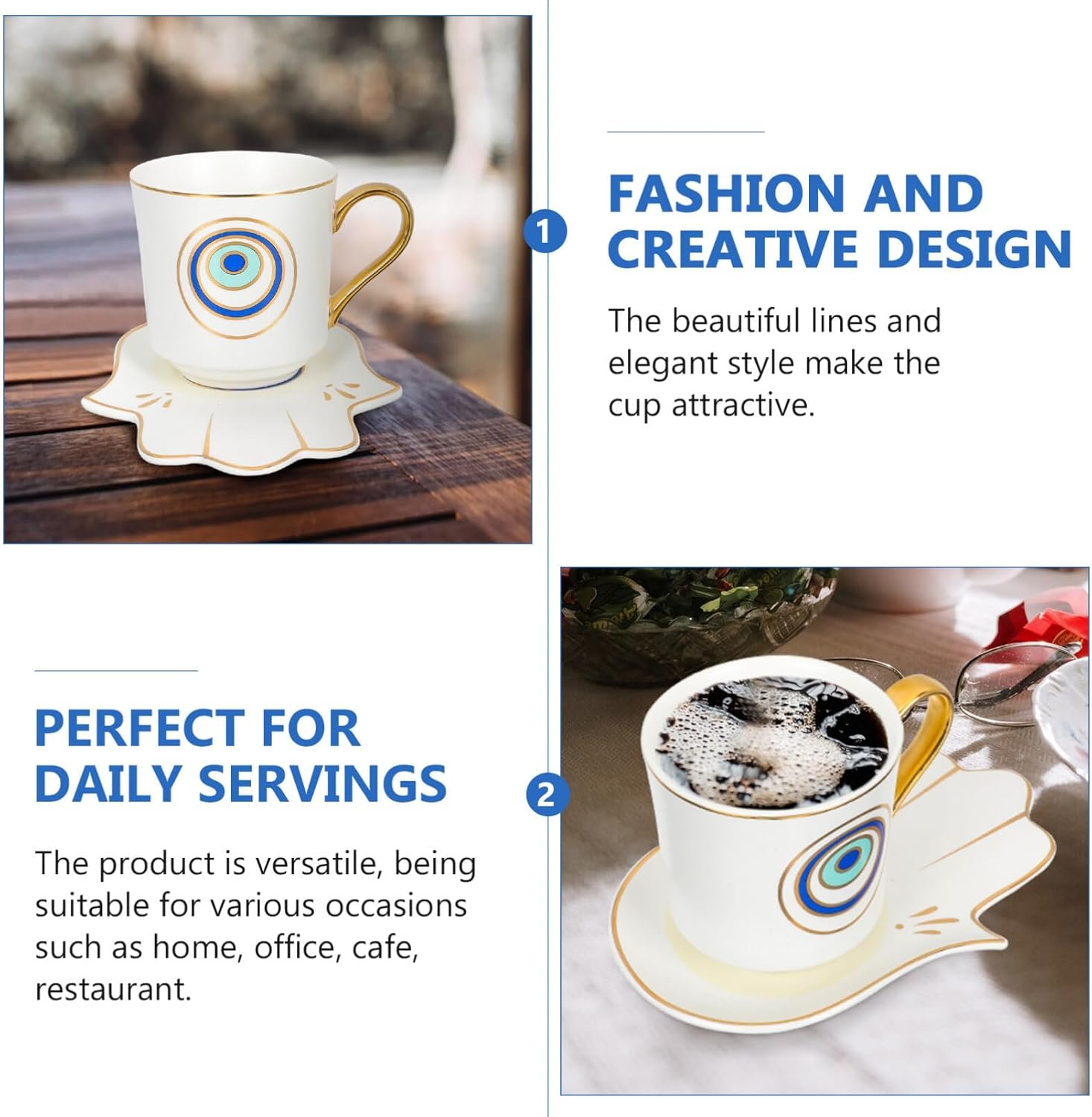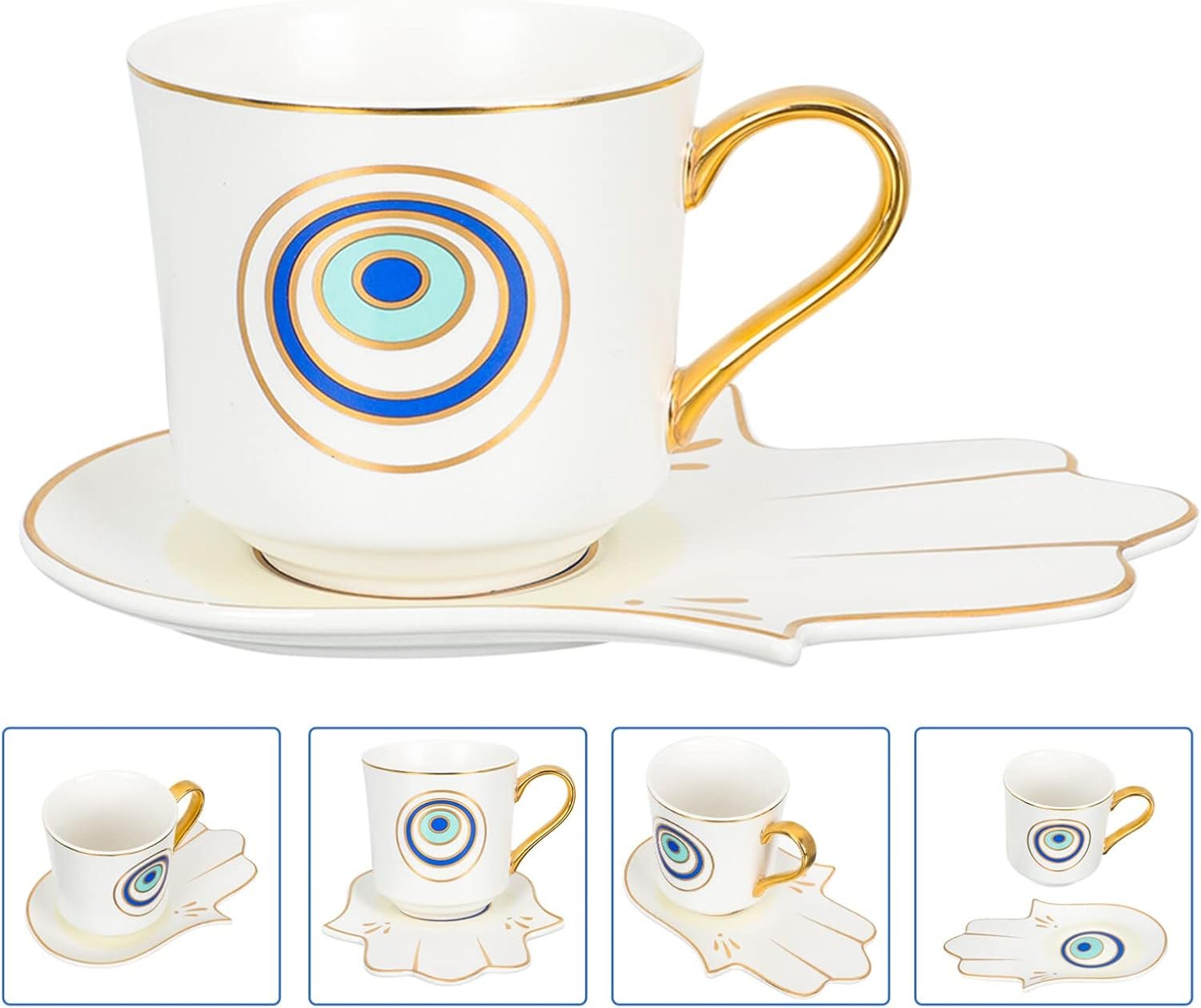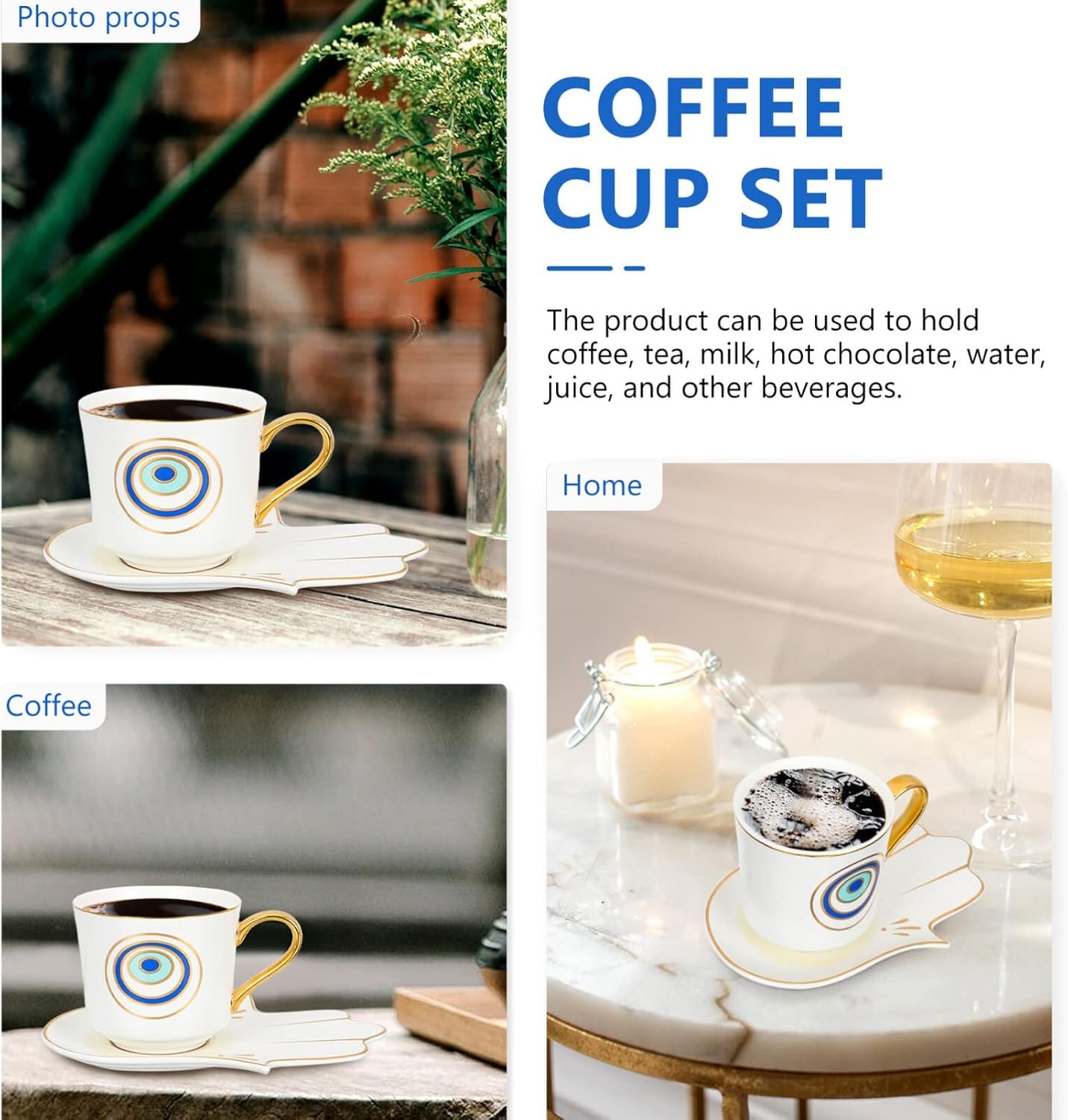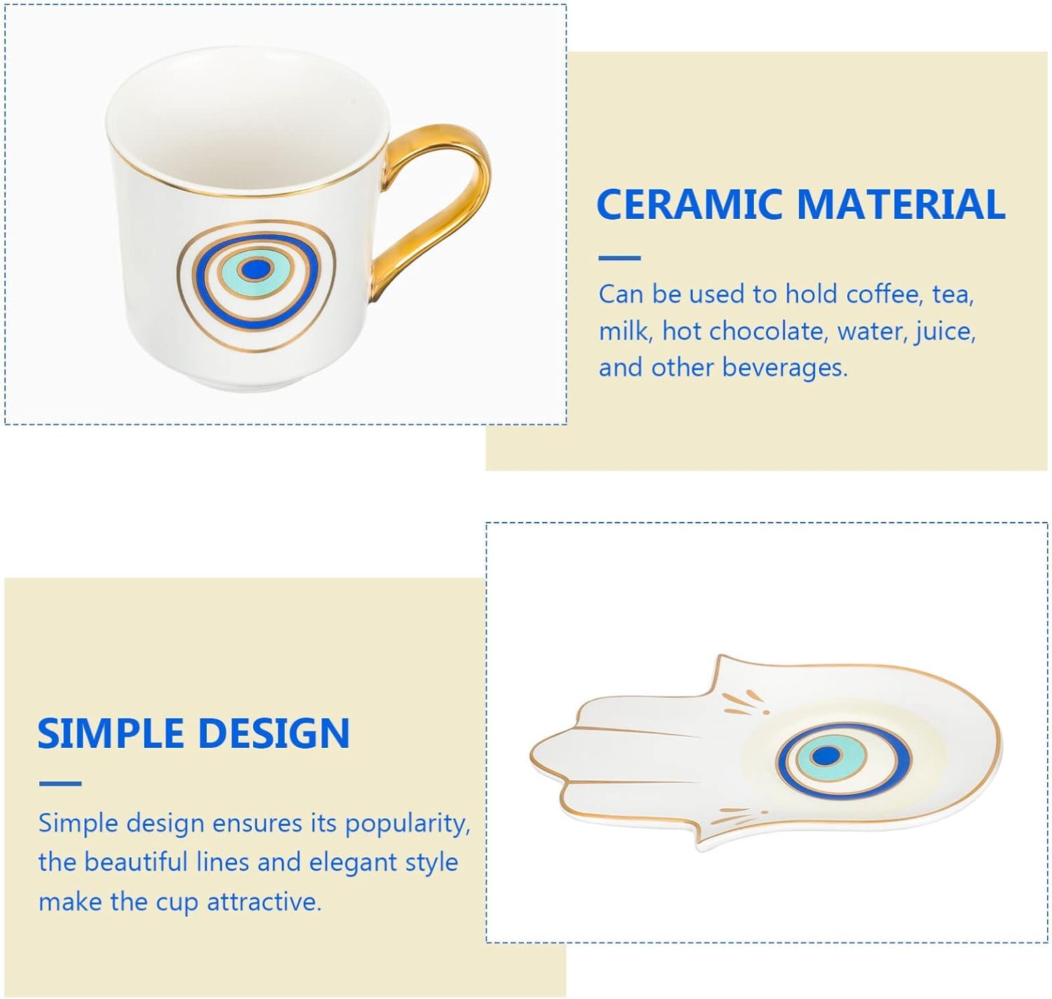 Evil Eye Coffee Cups Set: Turkish Blue Eye Espresso Cup Water Milk Mug Amulet Protection Tea Cup with Hamsa Hand Saucer Plate for Drinks Latte Lucky Decor, The product can be used to hold coffee, tea, milk, hot chocolate, water, juice, and other beverages