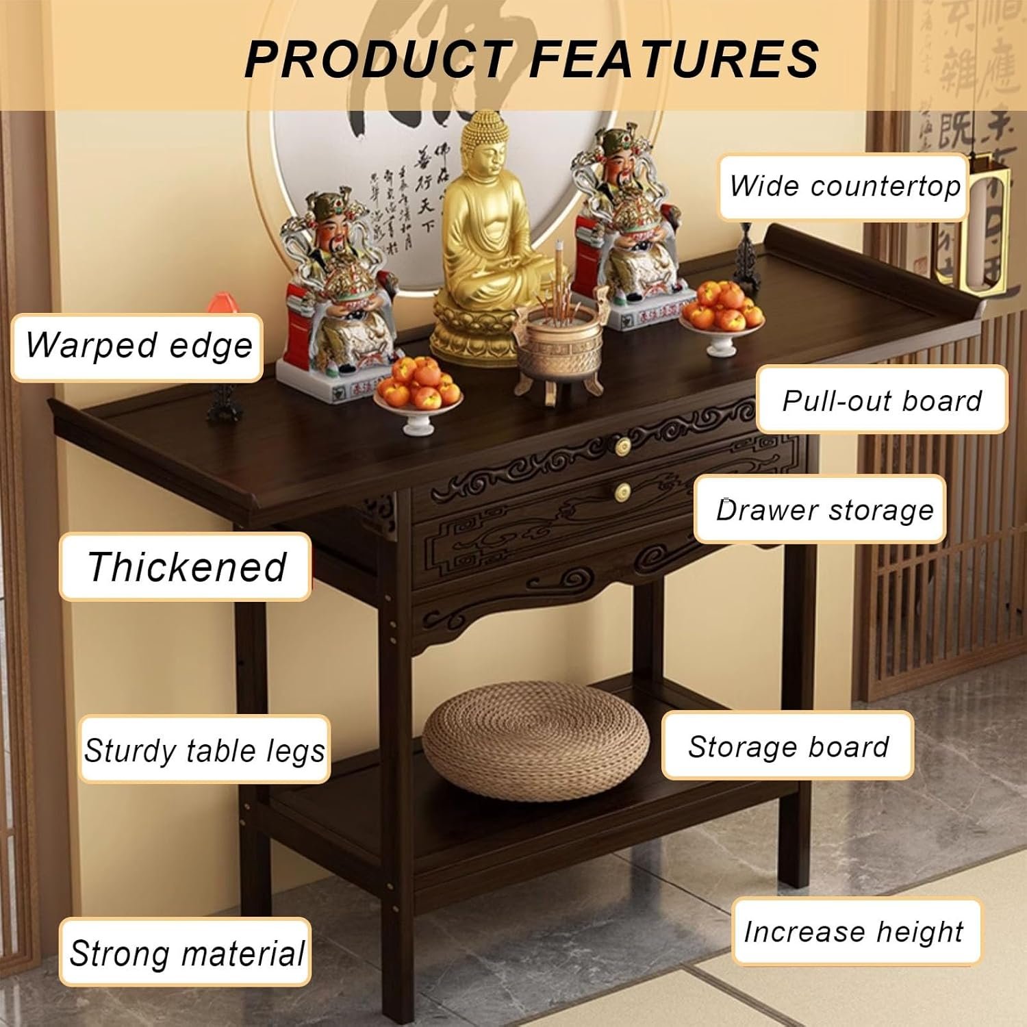 Classic Style for Versatile Use:Blending traditional craftsmanship with modern utility, this altar table is suitable for home sanctuaries, temples, classrooms, or retail settings.