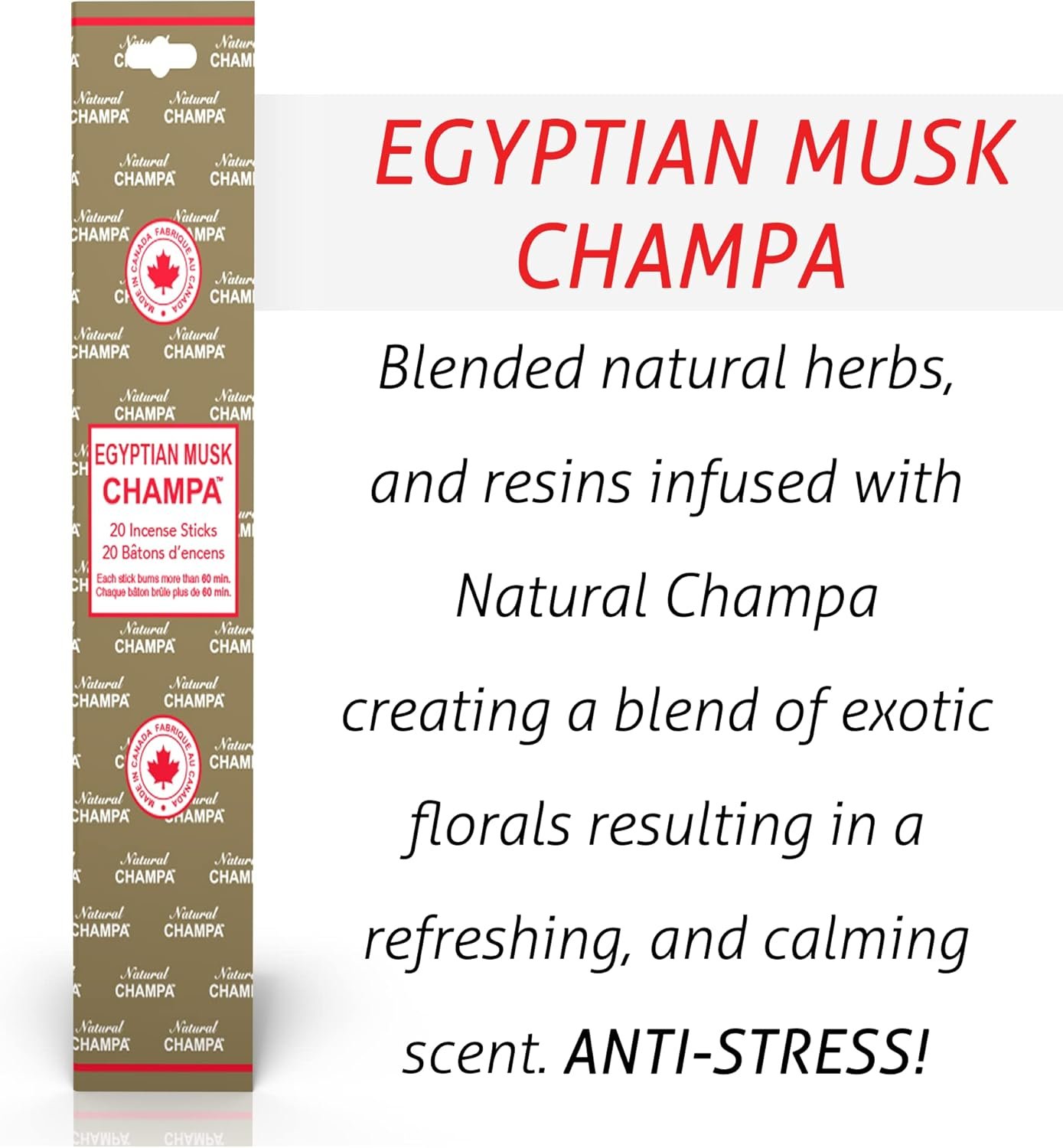 4. EGYPTIAN MUSK CHAMPA (Gold): Blended natural herbs, and resins infused with Natural Champa creating a blend of exotic florals resulting in a refreshing, and calming scent. ANTI-STRESS!
