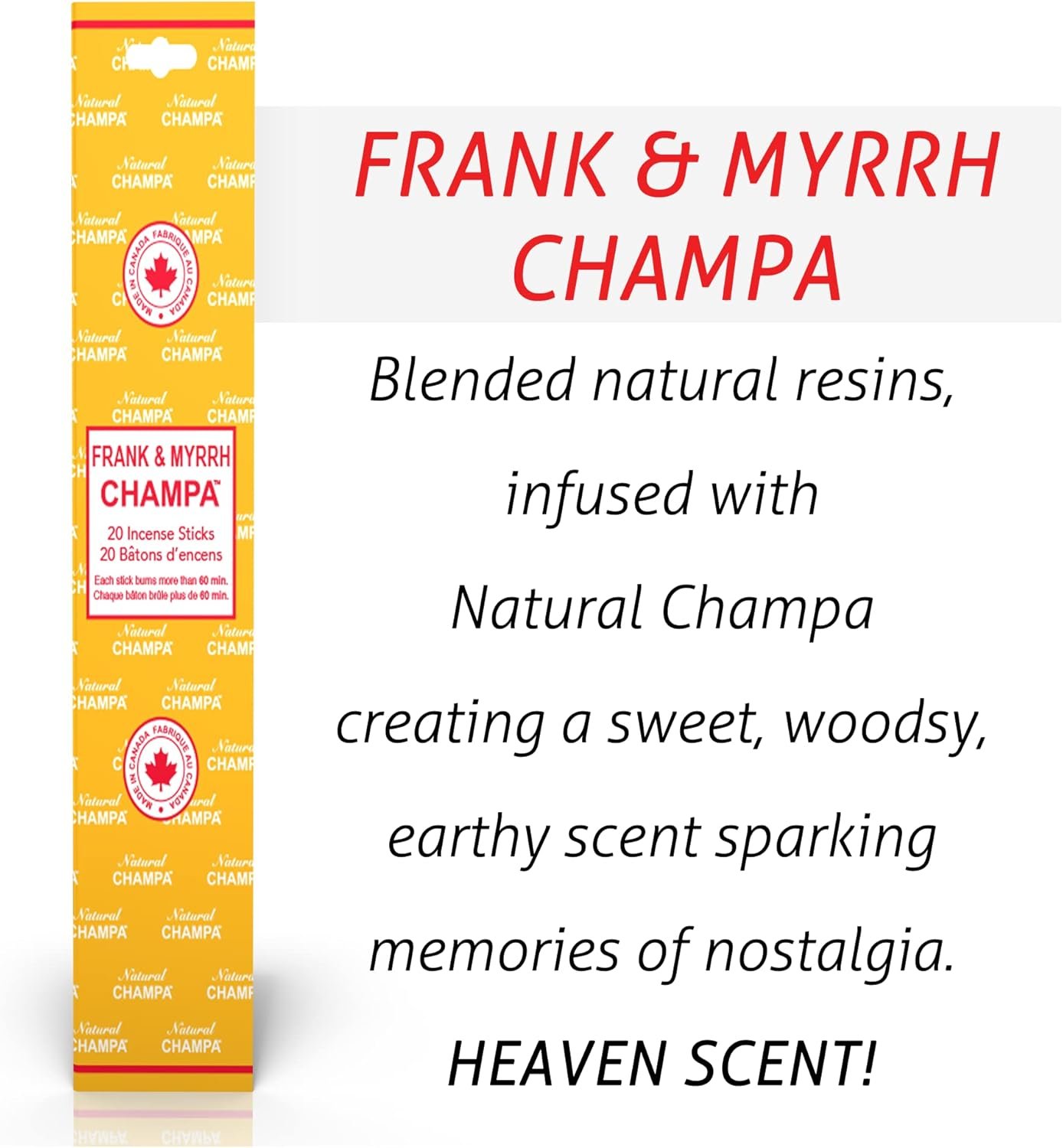5. FRANK & MYRRH CHAMPA (Yellow): Blended natural resins, infused with Natural Champa creating a sweet, woodsy, earthy scent sparking memories of nostalgia. HEAVEN SCENT!
