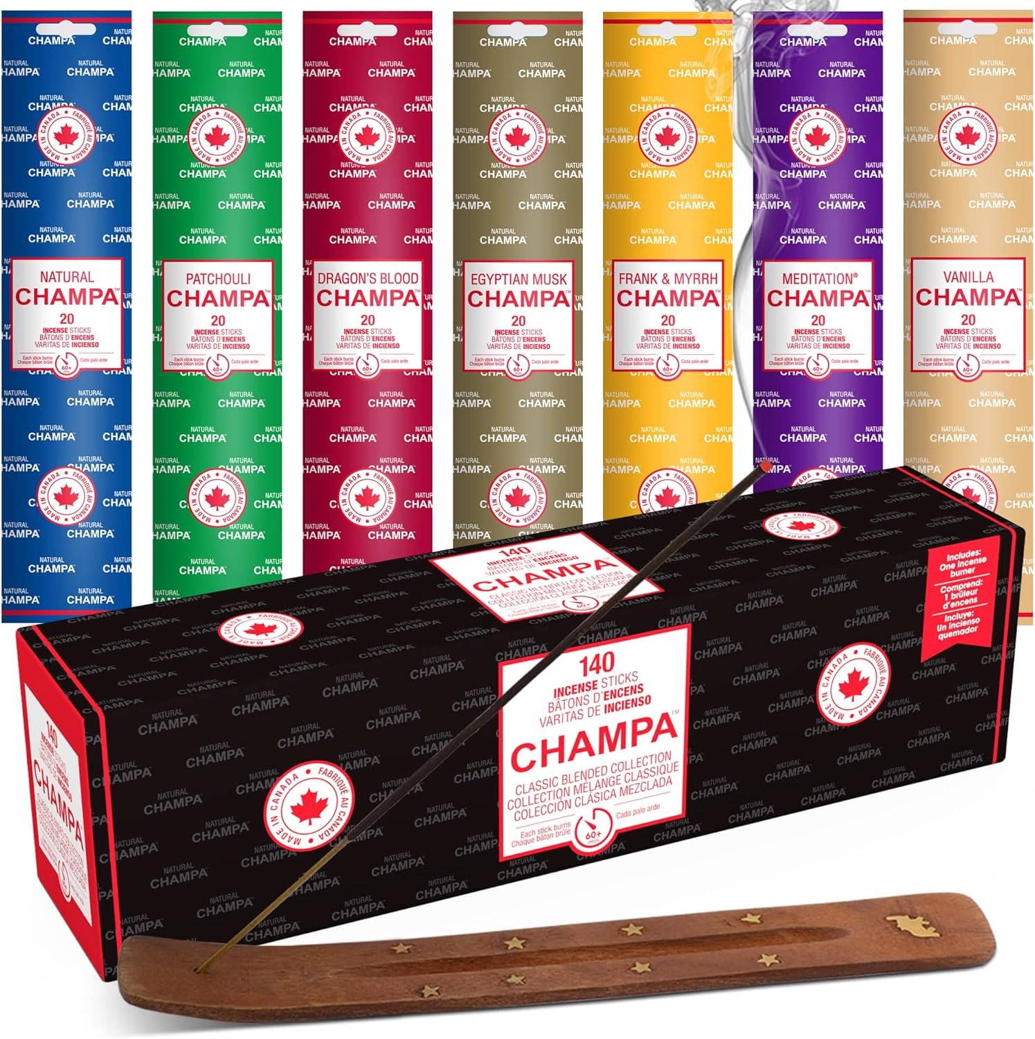 ✅ WHAT YOU GET: 140 Sticks in the Natural Champa Variety Set 20 Sticks Each for Original, Patchouli, Dragon’s Blood, Egyptian, Frankincense & Myrrh, Meditation and Vanilla.