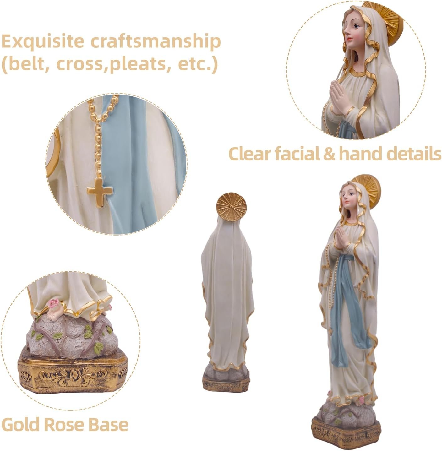 𝐌𝐚𝐭𝐞𝐫𝐢𝐚𝐥 𝐃𝐞𝐬𝐜𝐫𝐢𝐩𝐭𝐢𝐨𝐧: Crafted from top-quality resin, our Virgin Mary statue is durable and easy to clean. Measuring 3.9″ x 3.3″ x 15″, she’s the right size for any space. A quick wipe brings back her original beauty, keeping her looking new.