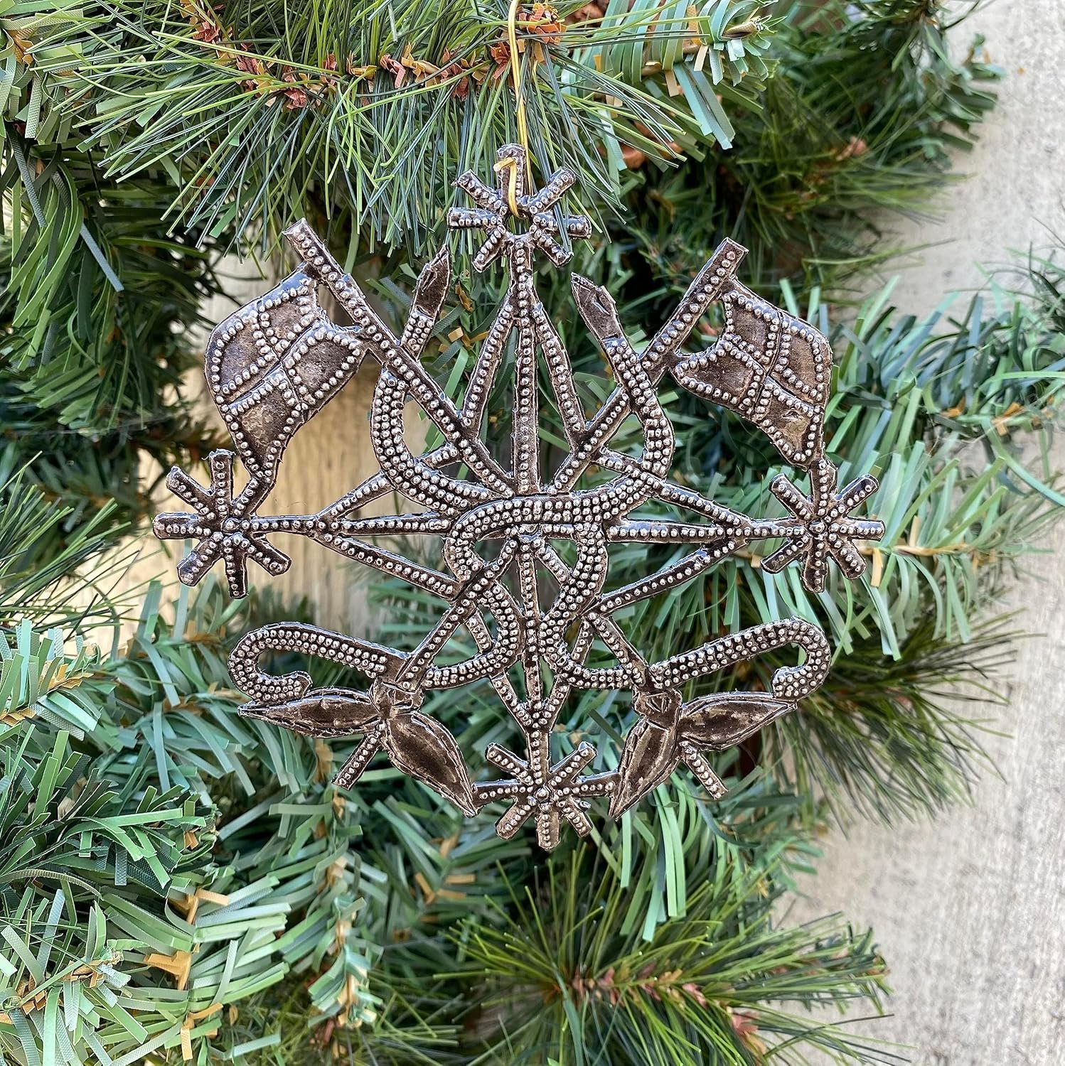 Introducing the mesmerizing Metal Veve Dambala Wall Art, meticulously handcrafted in the vibrant country of Haiti. This stunning piece of artwork captures the essence of Haitian culture and spirituality, showcasing the remarkable talent of local artisans.