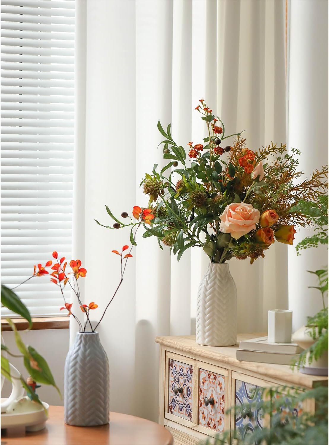 CERAMIC VASES DECOR: Crafted from high-quality ceramic, Funky weave appearance.The inside of the vase is glazed and supports water planting. Each vase size is 4″D X4″WX8″H.Mouth diameter of 1.57 inches.