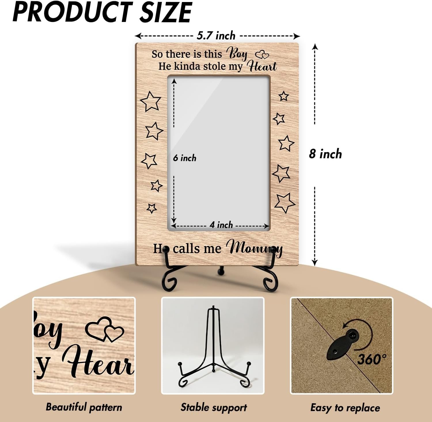 Dimensions: You will receive a wooden photo frame approximately 8×5.7 inches holding a 4×6 inch photo with an iron frame to stabilise the frame on any flat surface.