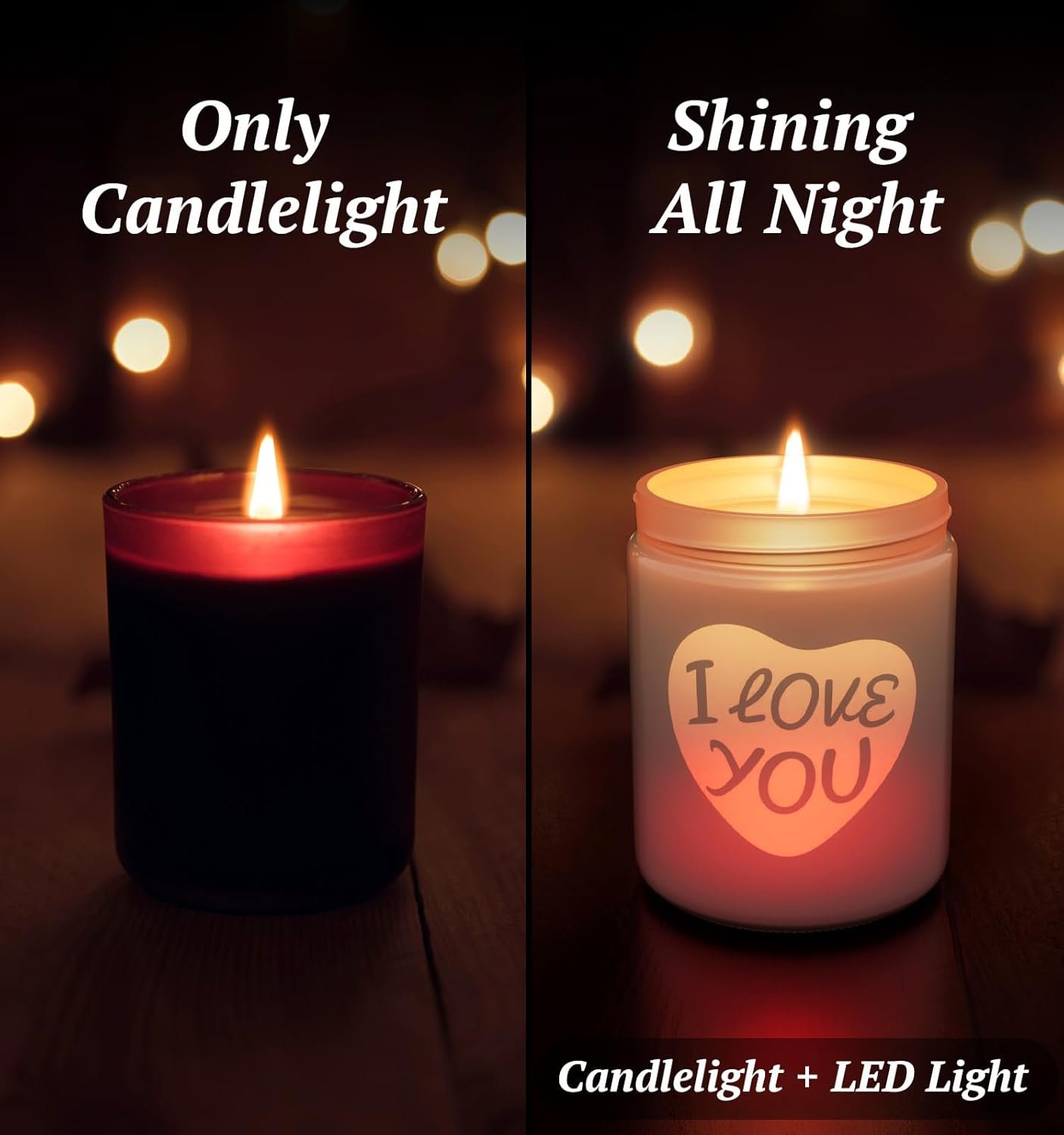 Enchanting LED Light & Scented Ambiance – The soft, flickering LED light creates a serene, romantic glow. When the candles are lit, the pattern of the hearts will be filled with red light, giving off a warm and welcoming glow, perfect for setting a cozy mood on Valentine’s Day.