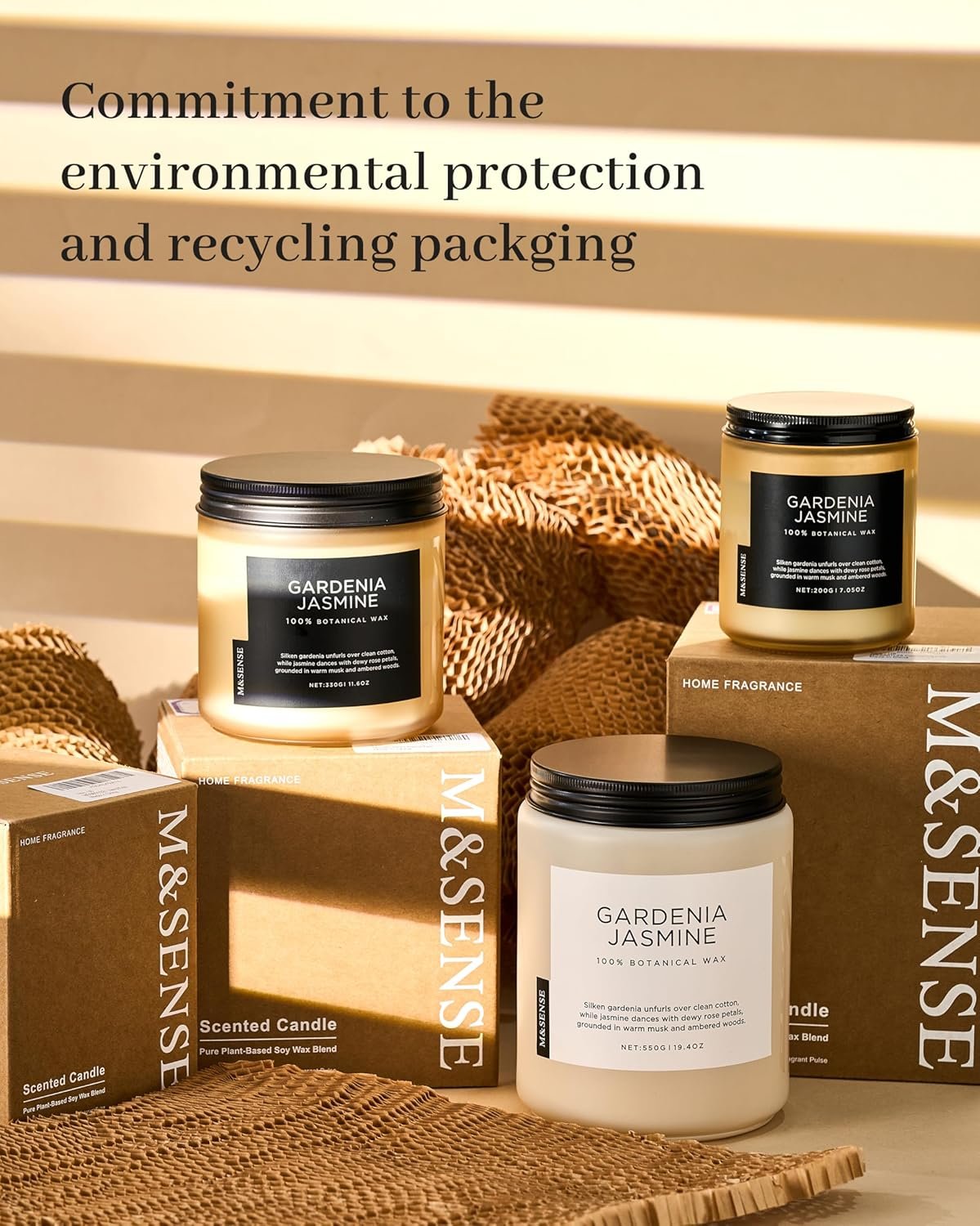 Sustainable Formula – M&SENSE candles are all made with the finest and most natural ingredients. Using a high-end blend of American grown soy and vegetable wax with double unbleached cotton wicks in a reusable and recyclable glass jar. Packaged in recycled cardboard box for a more sustainable future