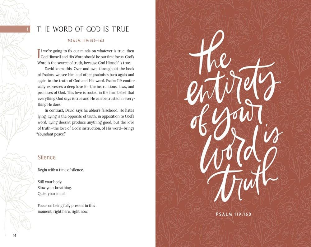 A gentle call to silence, an opening prayer, and a thoughtful reflection on a Bible verseGuided meditation on Scripture using the centuries-old practice of lectio divina—a framework of Christian meditation that helps you slow down and linger on God’s WordA prayer of surrender and prompts for how to live out the truths God is speaking to youInspired art to draw you into each meditation as you consider what is lovely, true, excellent, and worthy of praise