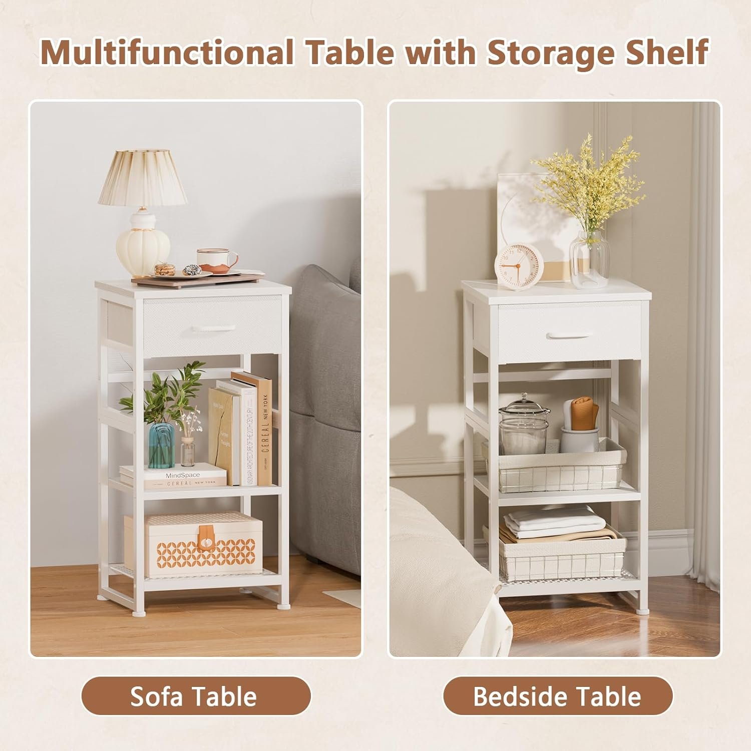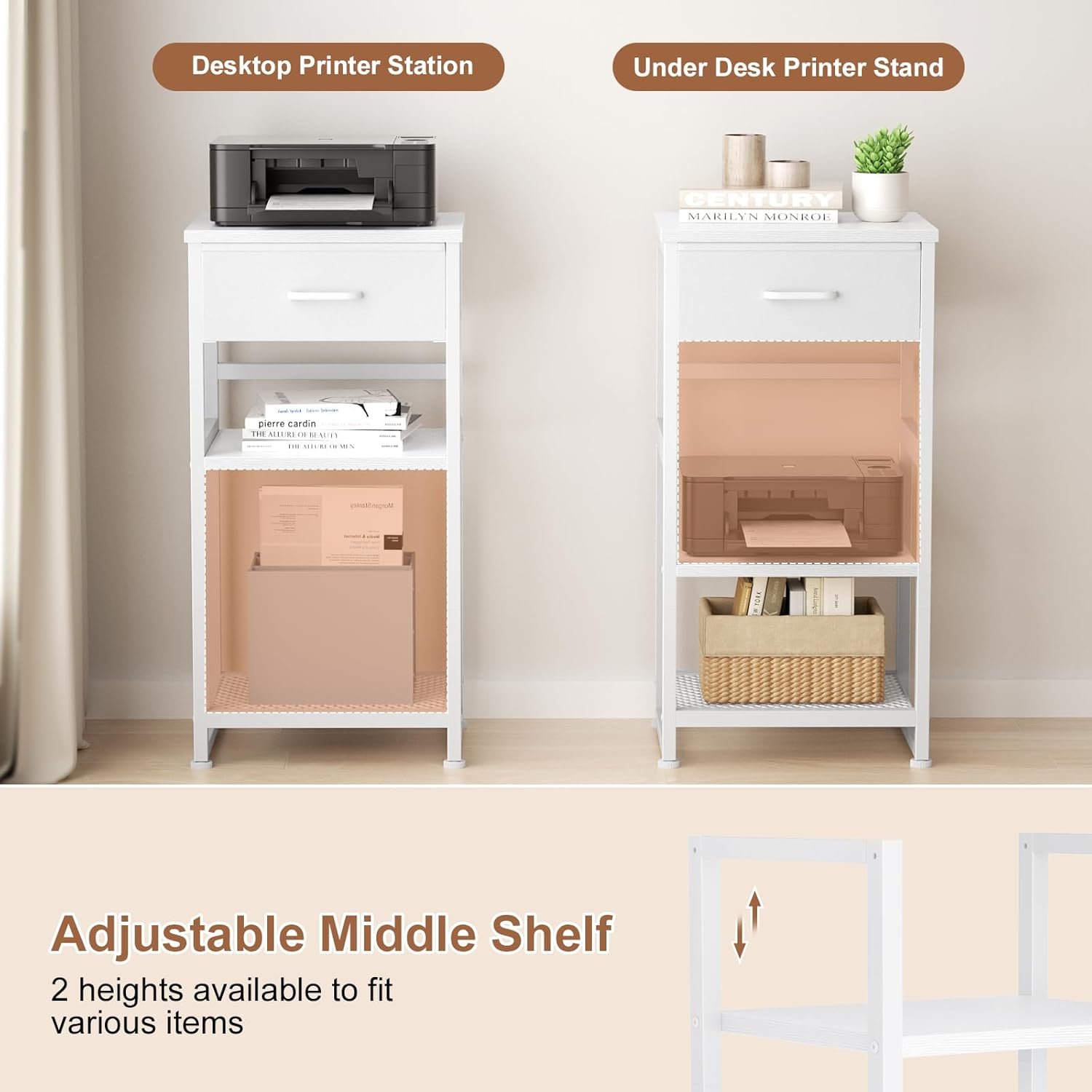 【Upgraded Adjustable Shelf】The small printer desk holder have an adjustable shelf,You can adjust the height of the board to store different height products.The small nightstand also blends the advantages of private and open storage/display to suit your place